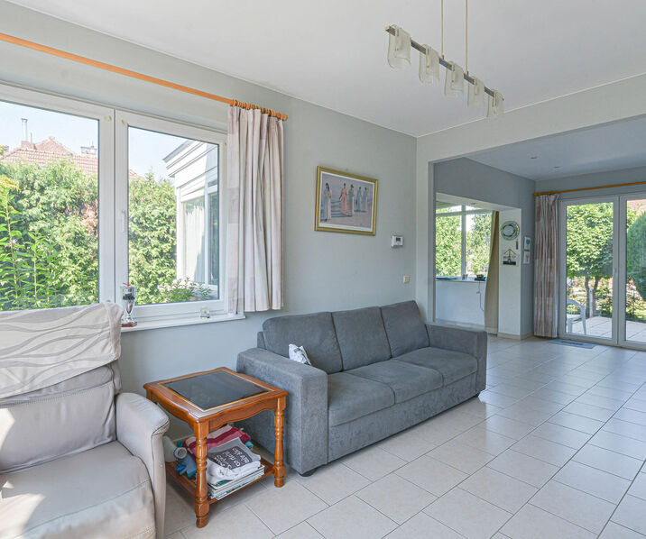 Le rez-de-chaussée offre un hall d’entrée avec toilette invités et espace vestiaire, un lumineux séjour-salle à manger de +/-35 m² donnant sur une agréable terrasse, un jardin privatif et une spacieuse cuisine ouverte entièrement équipée avec coin petit-déjeuner.
