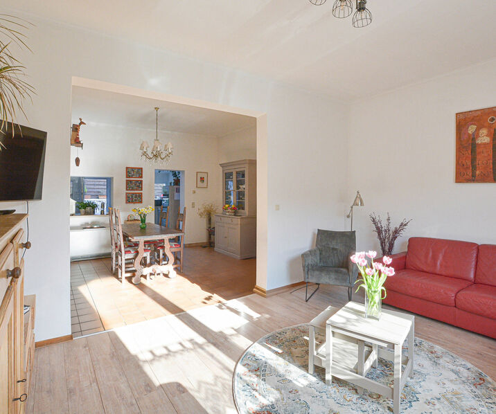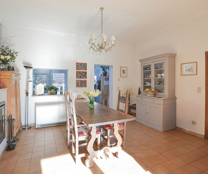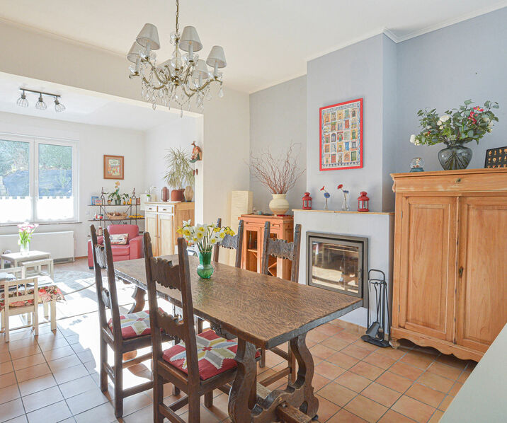Rez-de-chaussée : hall d’entrée, lumineux séjour-salle à manger de +/-38 m² avec feu-ouvert, cuisine moderne entièrement équipée donnant accès au jardin et à 2 agréables terrasses. Au rez-de-chaussée, vous trouverez également une première salle de bains (baignoire avec douche, évier et WC), une buanderie et un garage.