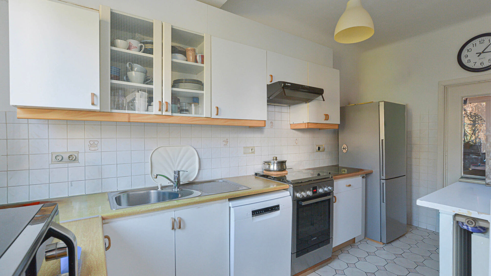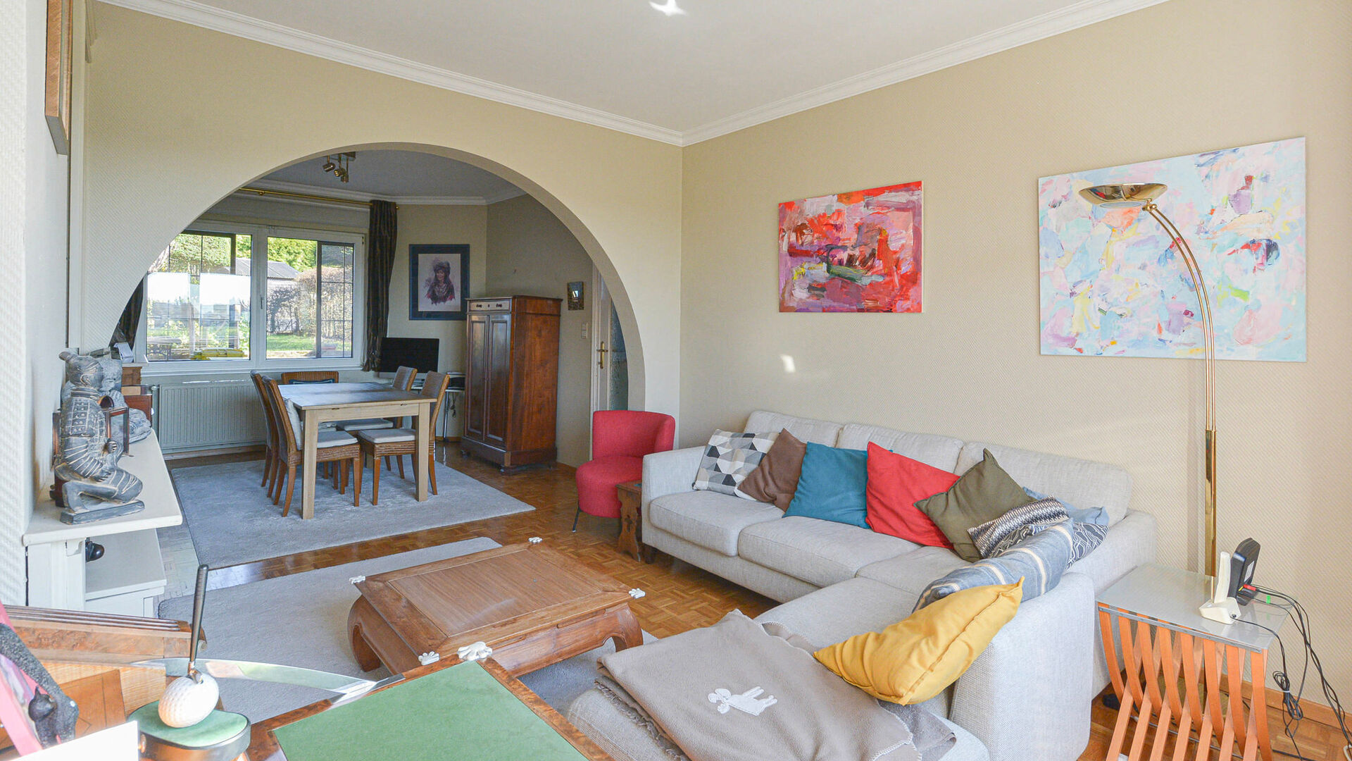 - Rez-de-chaussée : Hall d’entrée avec toilette séparée, lumineux séjour et salle à manger de+/-30m², cuisine équipée donnant accès à une agréable terrasse et beau jardin avec abri de jardin.