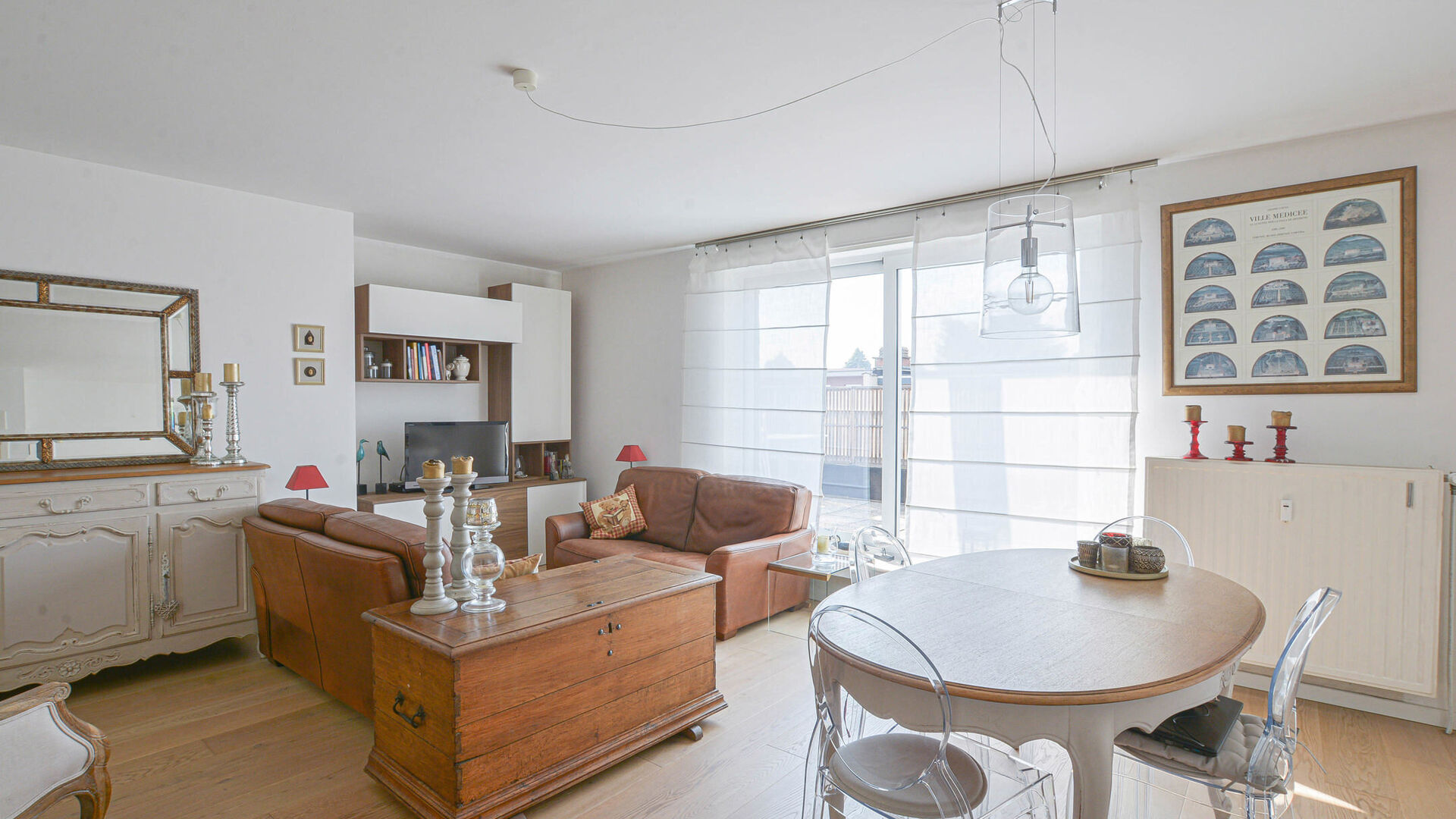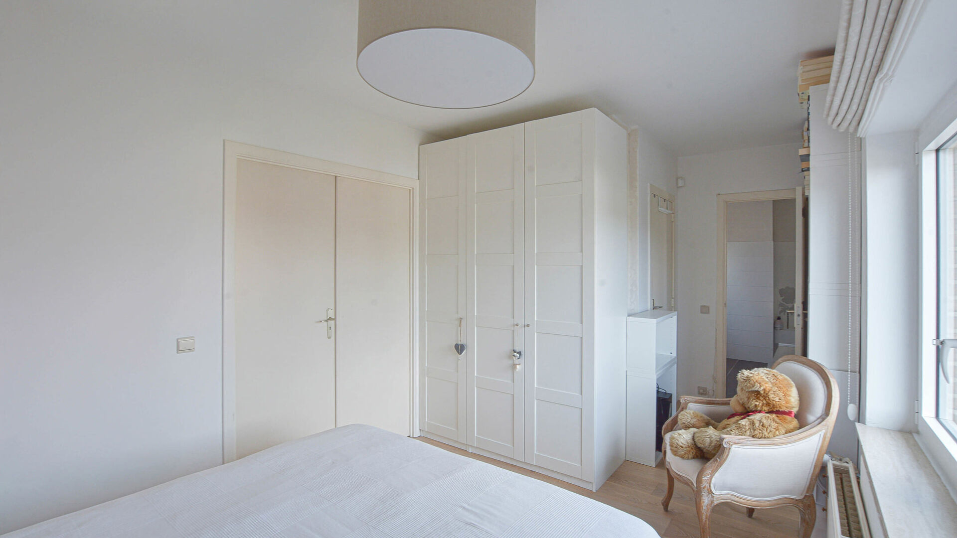 Hall d’entrée avec espace vestiaire et toilette séparée, d’une cuisine équipée (four, taques), lumineux séjour-salle à manger de ± 18 m² donnant accès à une agréable terrasse orientée Ouest. La partie nuit comprend une chambre de ± 11 m² avec salle de bains attenante, équipée d’une baignoire avec douche, évier et d’un raccordement pour machine à laver.