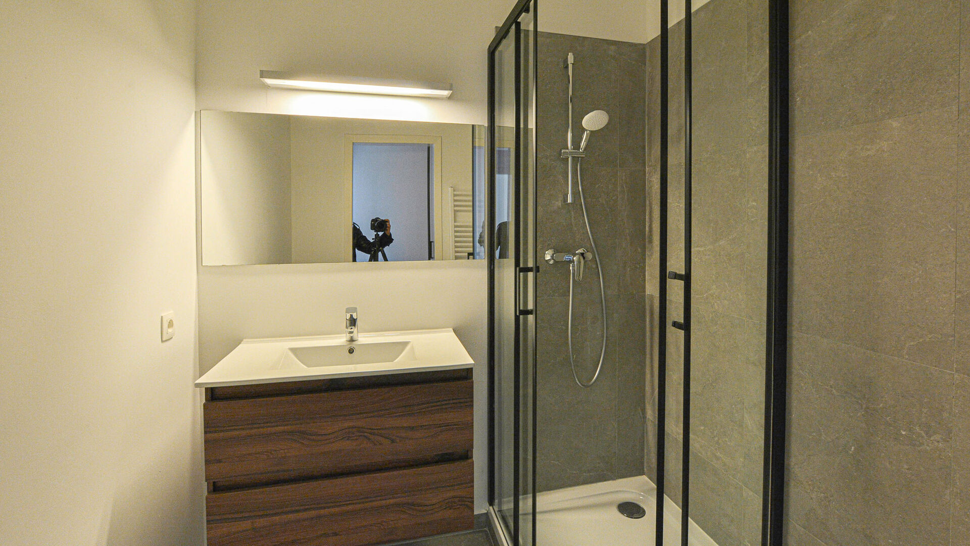 Hall d'entrée // WC séparé // séjour +/- 20m² donnant accès à la terrasse +/- 12m² orienté sud-ouest // cuisine équipée (frigo, congélateur, four, taques induction, lave-vaisselle) // 2 chambres +/- 14,5m² - 11m² // salle de douche (douche et évier) // cave avec connexion machine à laver.