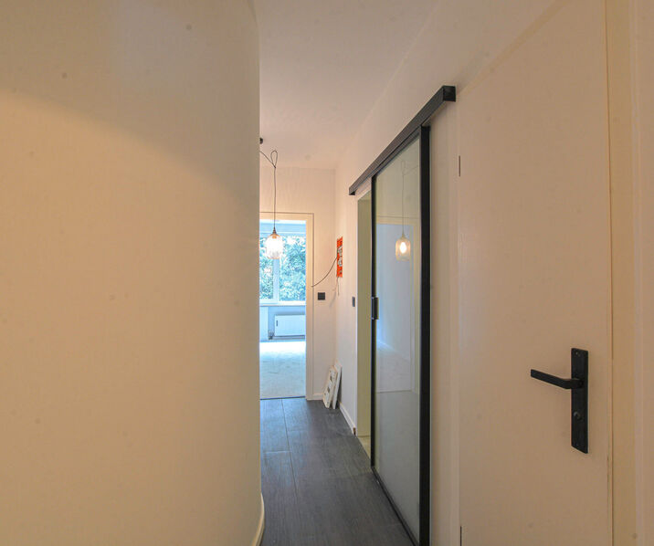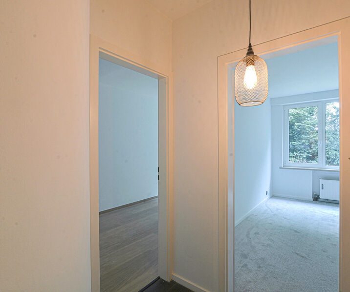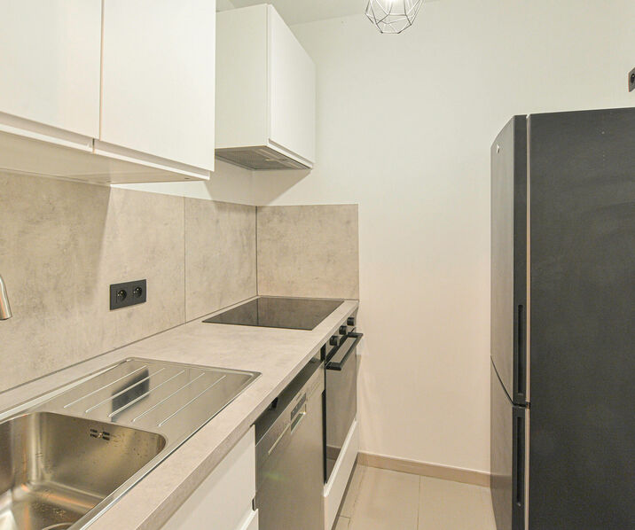 Hall d'entrée // WC séparé // séjour +/- 20m² donnant accès à la terrasse +/- 12m² orienté sud-ouest // cuisine équipée (frigo, congélateur, four, taques induction, lave-vaisselle) // 2 chambres +/- 14,5m² - 11m² // salle de douche (douche et évier) // cave avec connexion machine à laver.