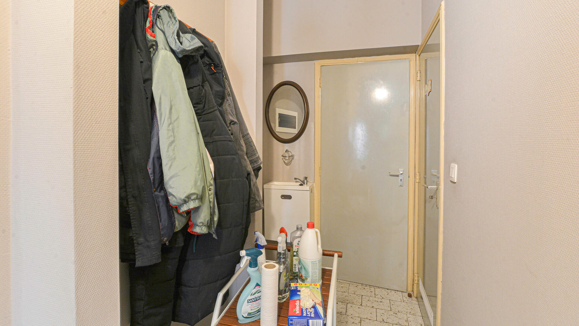 Ce studio +/- 67m² est situé au sous-sol d’un petit immeuble équipé d’un ascenseur et se compose comme suit :