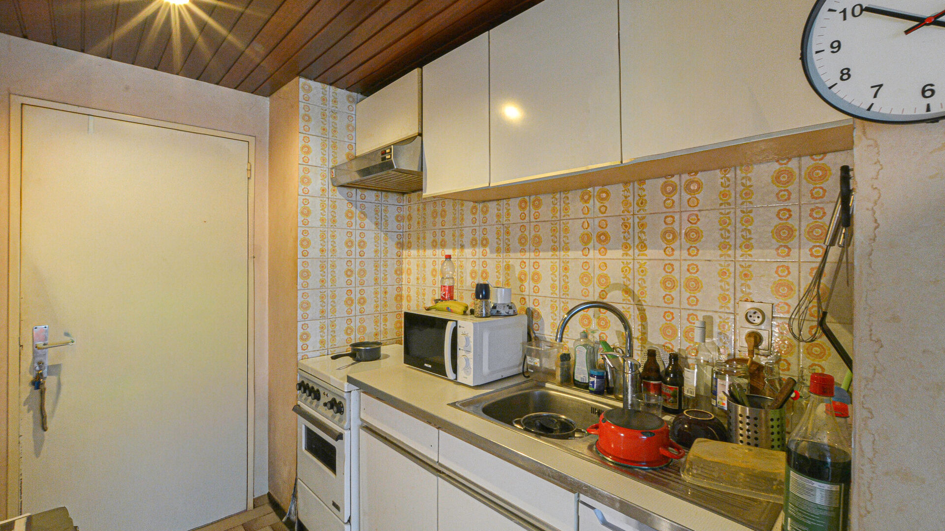 Cuisine (frigo, taques) // espace de vie +/- 16,5m² // salle de bain avec petit bain, WC et évier.