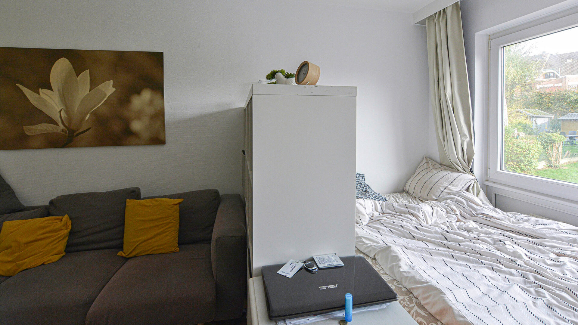 Cuisine (taques, frigo, micro-ondes/four) // espace de vie/coin à dormir +/- 16,2m² // salle de bain (baignoire, évier et WC).