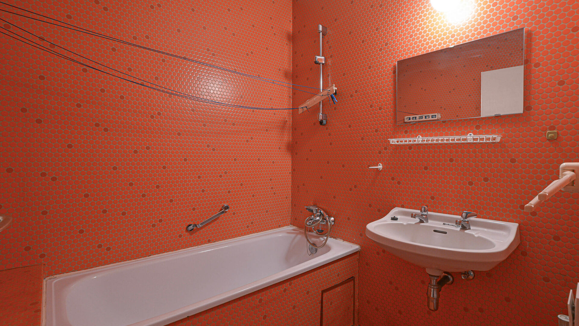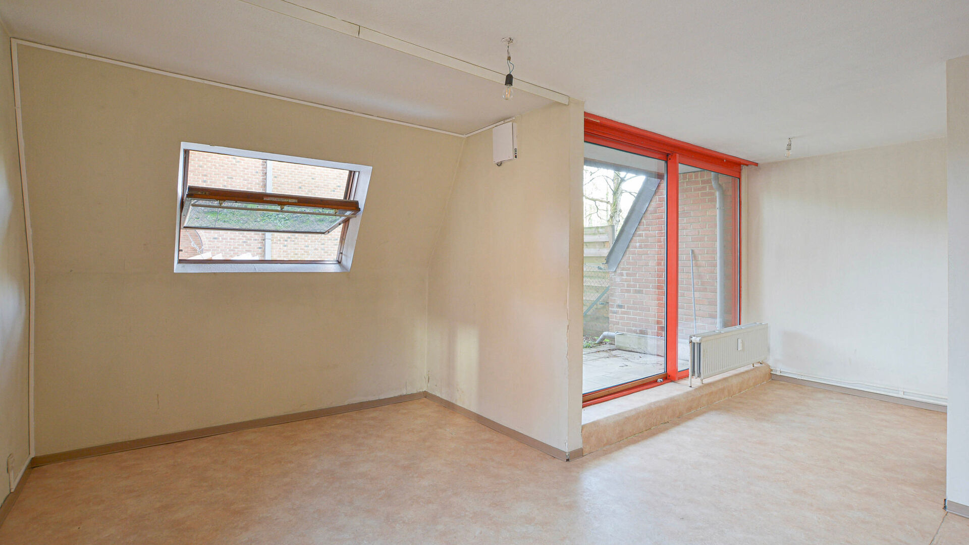 Hall d'entrée // WC séparé // salle de bain avec baignoire et évier // séjour/chambre +/- 27m² donnant accès au jardin // espace cuisine fermé // cave.
