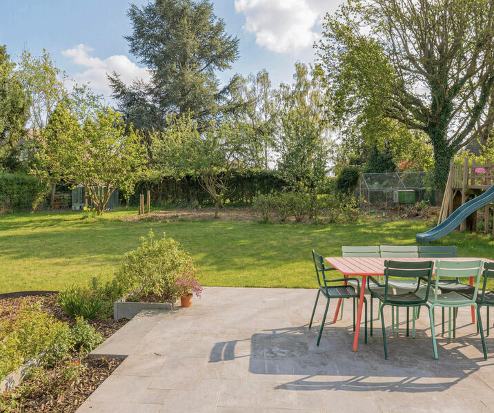 Hall d’entrée avec toilette invités et vestiaire intégré, lumineux séjour et salle à manger de +/-50 m² avec feu ouvert et accès direct à un magnifique jardin privatif avec terrasse attenante. Spacieuse cuisine entièrement