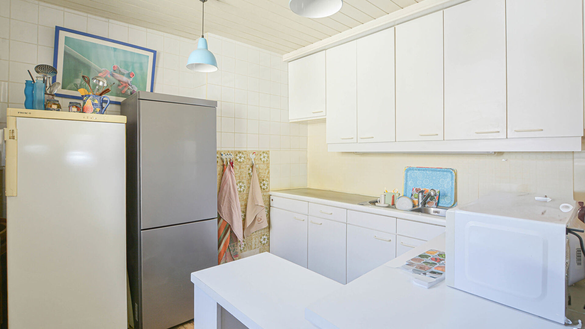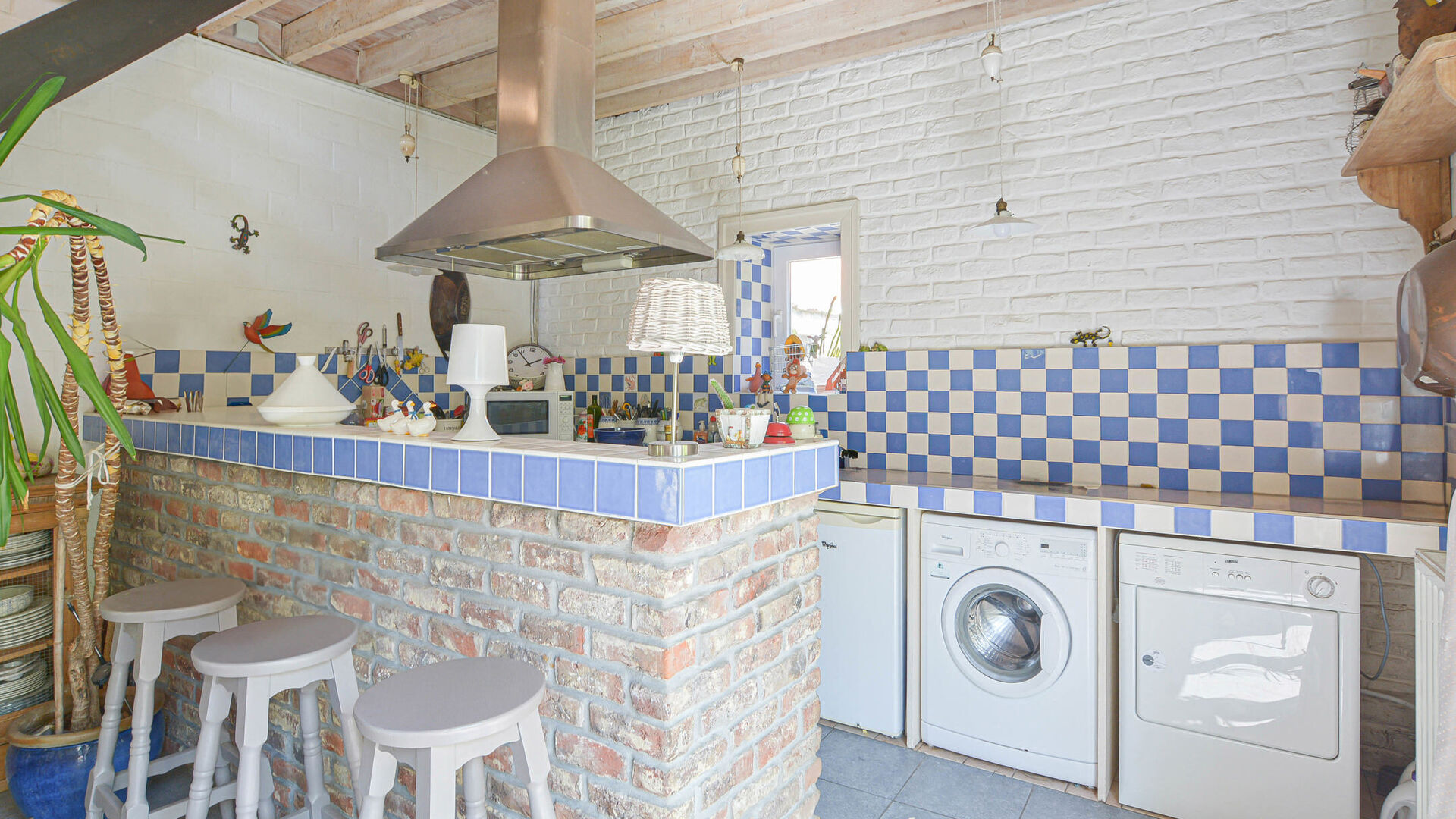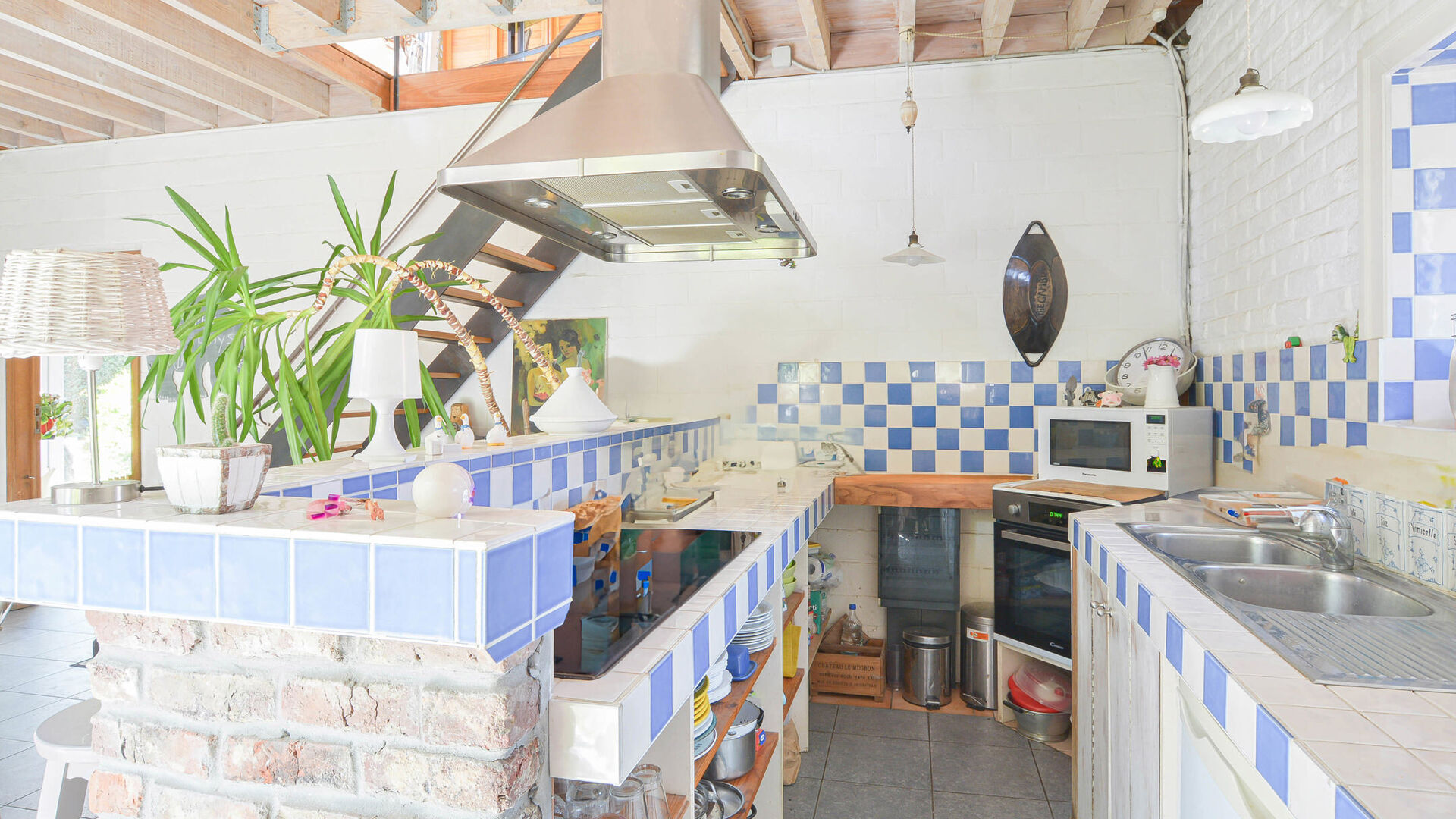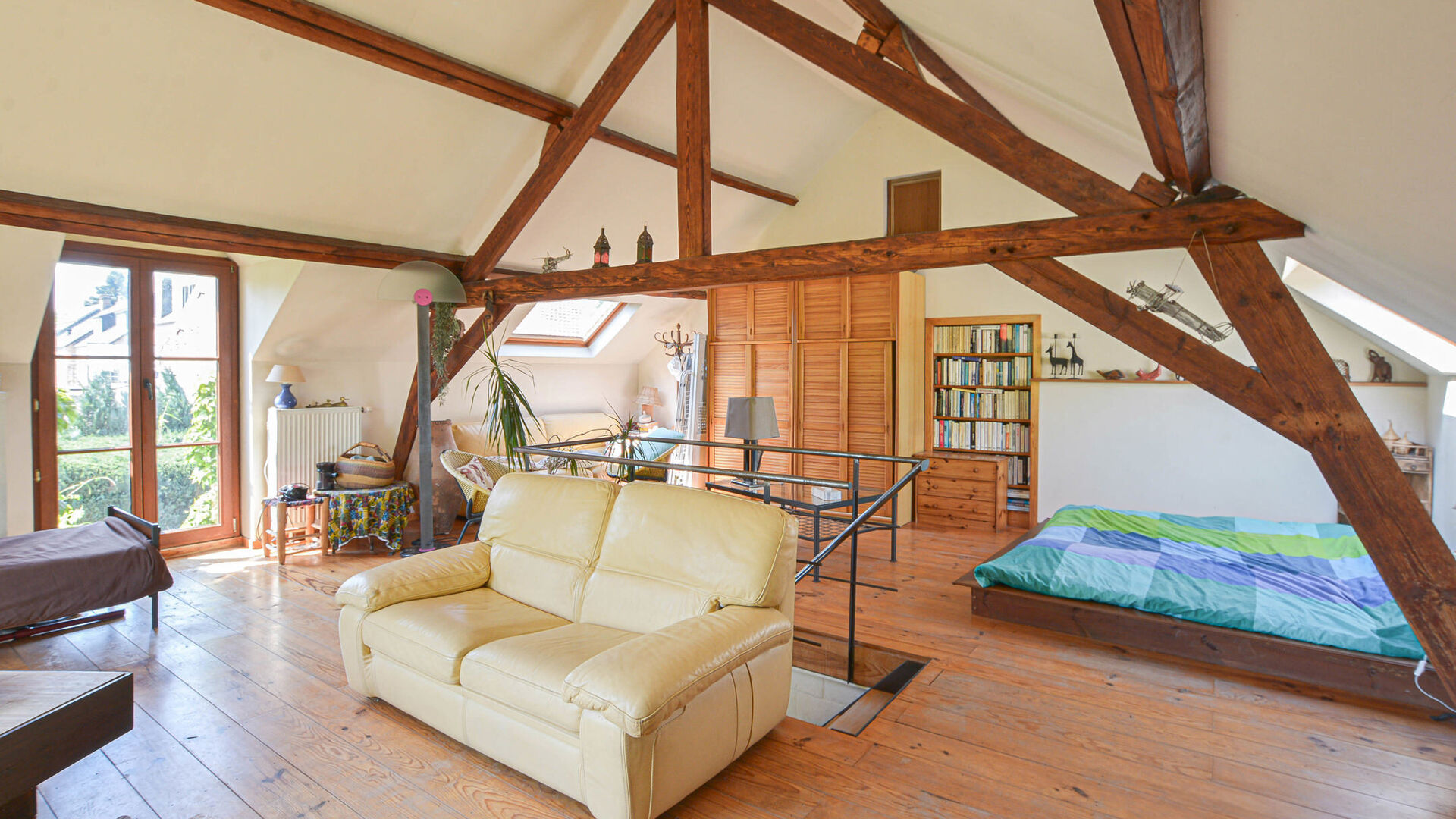 La partie droite dispose d’un espace de vie +/-27m² avec cuisine ouverte entièrement équipée, ainsi que d’une grande chambre/pièce polyvalente +/-44 m² à l'étage qui pourrait facilement être divisée en 2 chambres.