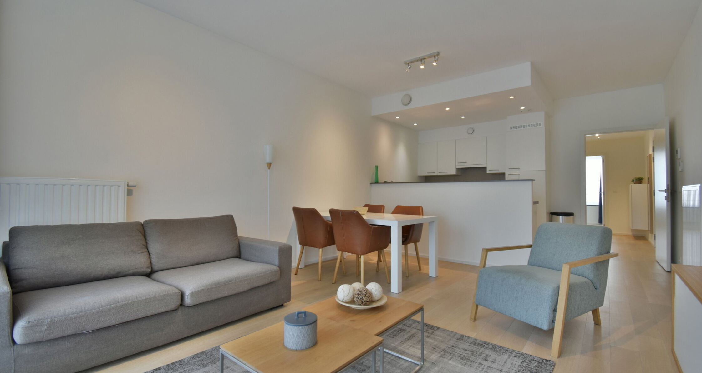 Inkomhal met apart toilet // berging // woonkamer +/- 30m² met toegang tot het zuidwestgericht terras +/- 11m² // ingerichte keuken (spoelbak, kookplaat, dampkap, vaatwasser, koelkast met vriesvak) // slaapkamer +/- 14m² // badkamer (bad met douche, dubbele wastafel).
