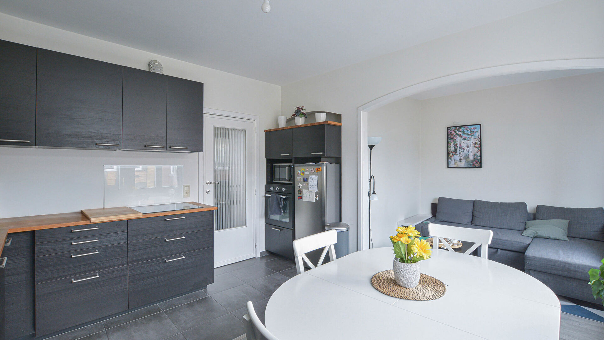 Inkomhal met apart toilet, leefruimte +/-20m² met volledig uitgeruste open keuken (kookplaat, oven, vaatwasmachine, koelkast/diepvries), 2 slaapkamers +/-14m-11m², badkamer uitgerust met inloopdouche, wastafel en plaats voor een wasmachine.
