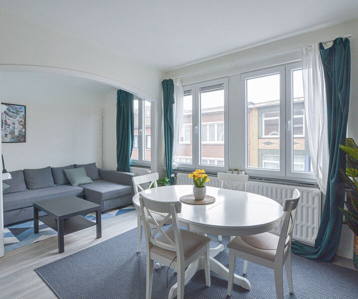 Mooi gemeubeld appartement +/-65m² gelegen op het 2e verdiep van een klein appartementsgebouw. Bestaande uit: