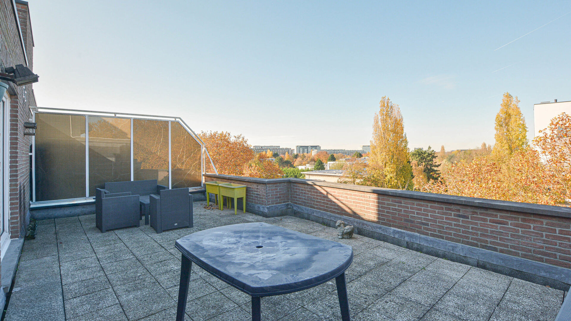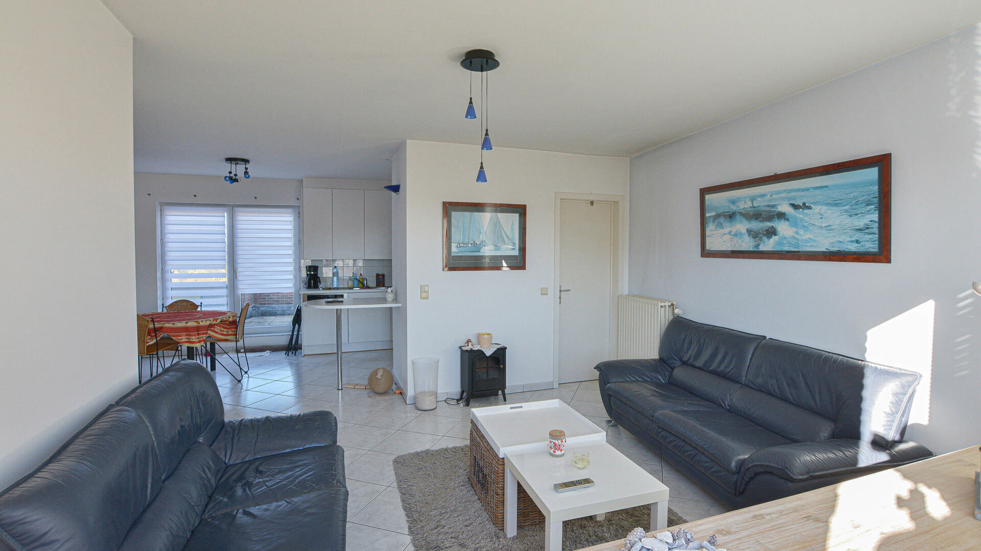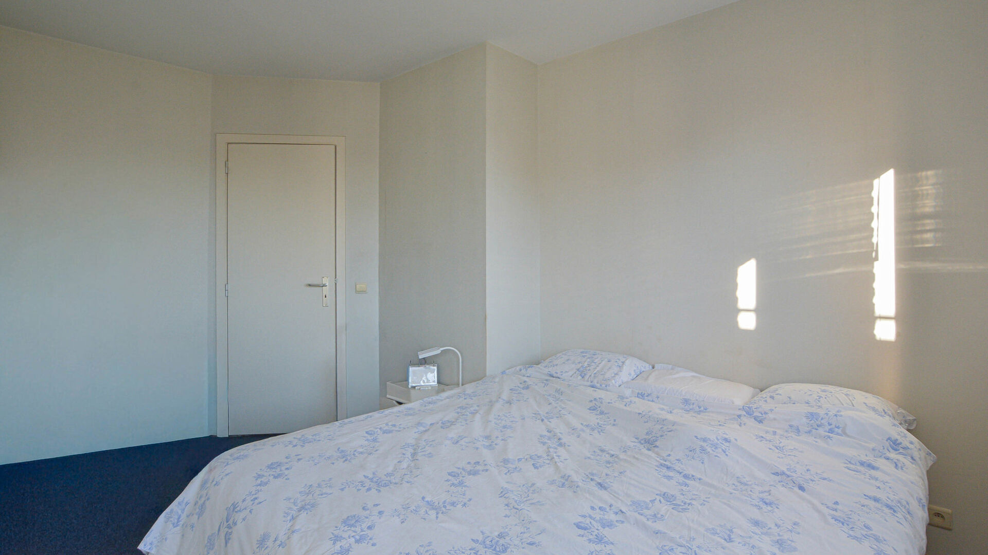 Inkom met ingebouwde kasten, lichtrijke woon-eetkamer van +/-35m² met volledig uitgeruste open keuken en toegang gevend tot twee ruime terrassen. Slaapkamer van +/-10m² met ingebouwde kast, badkamer met ligbad, toilet en wastafel.