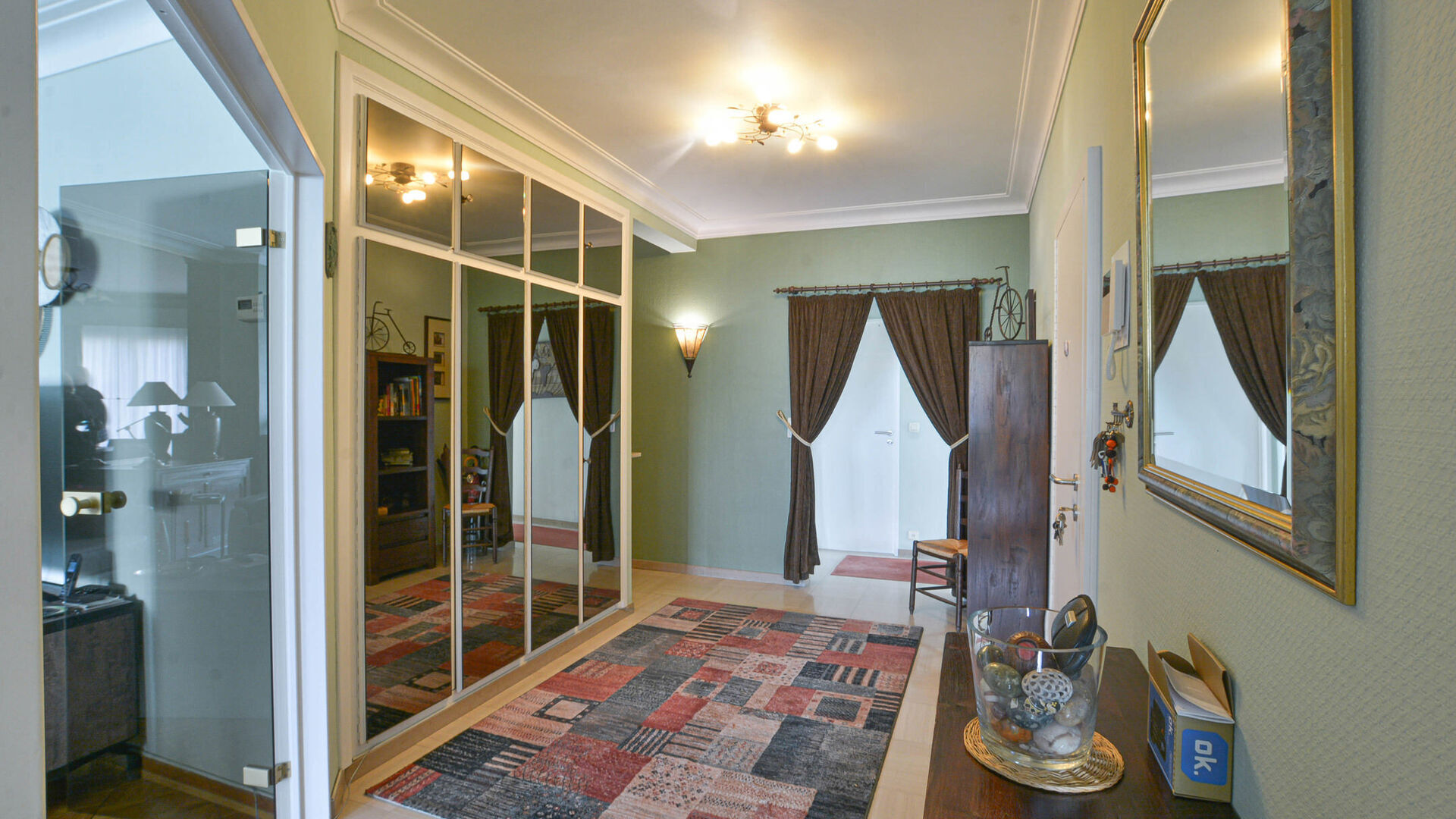 - Inkomhal die toegang geeft tot een ruime leefruimte van 32 m² met functionele open haard,