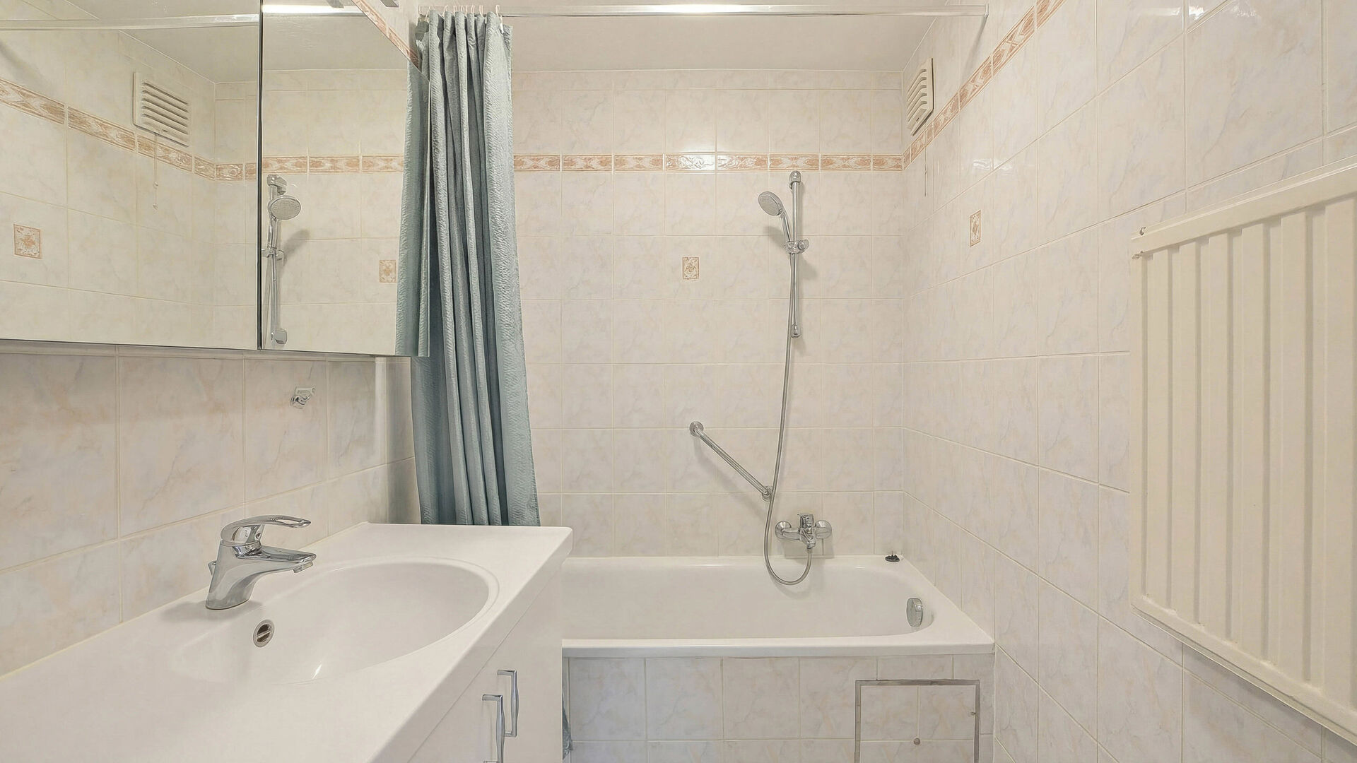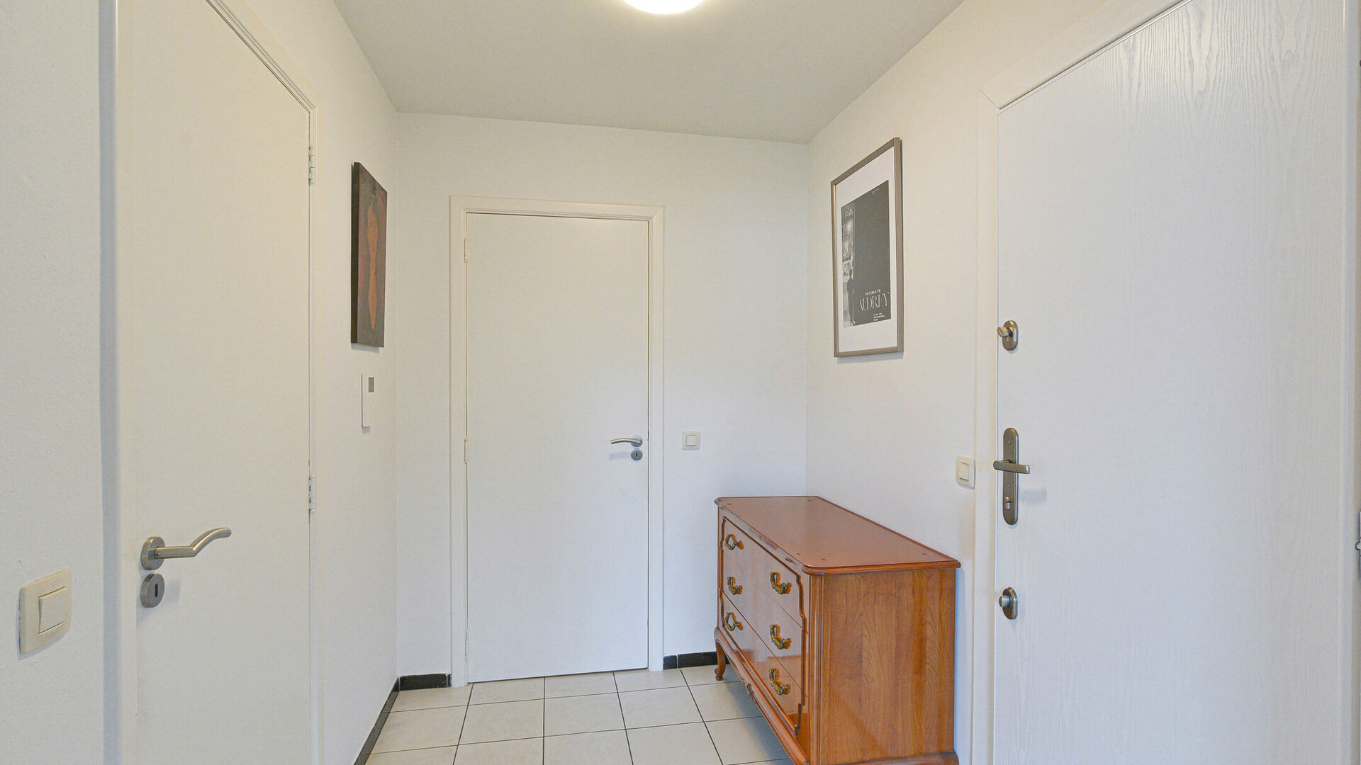 Inkomhal, lichtvolle woon-eetkamer +/-26m² met toegang tot een klein balkon, uitgeruste keuken (kookplaat, oven, vaatwasmachine). Nachthal met apart toilet, vestiaire en berging/wasplaats. 3 slaapkamers van +/-15-9-7m², Zuid georiënteerd terras +/-6m², badkamer met ligbad en wastafel.