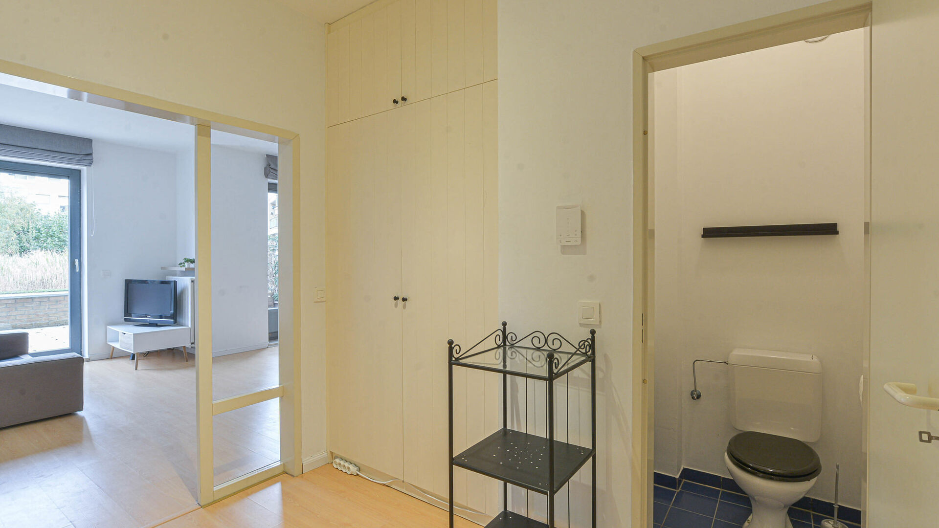 Inkomhal met ingebouwde vestiairekast en toilet, badkamer met ligbad en wastafel. De lichtrijke woon- en eetkamer van +/-21m² geeft toegang tot een ruim terras, volledig uitgeruste keuken met berging/technische ruimte en slaapkamer van +/-14m².