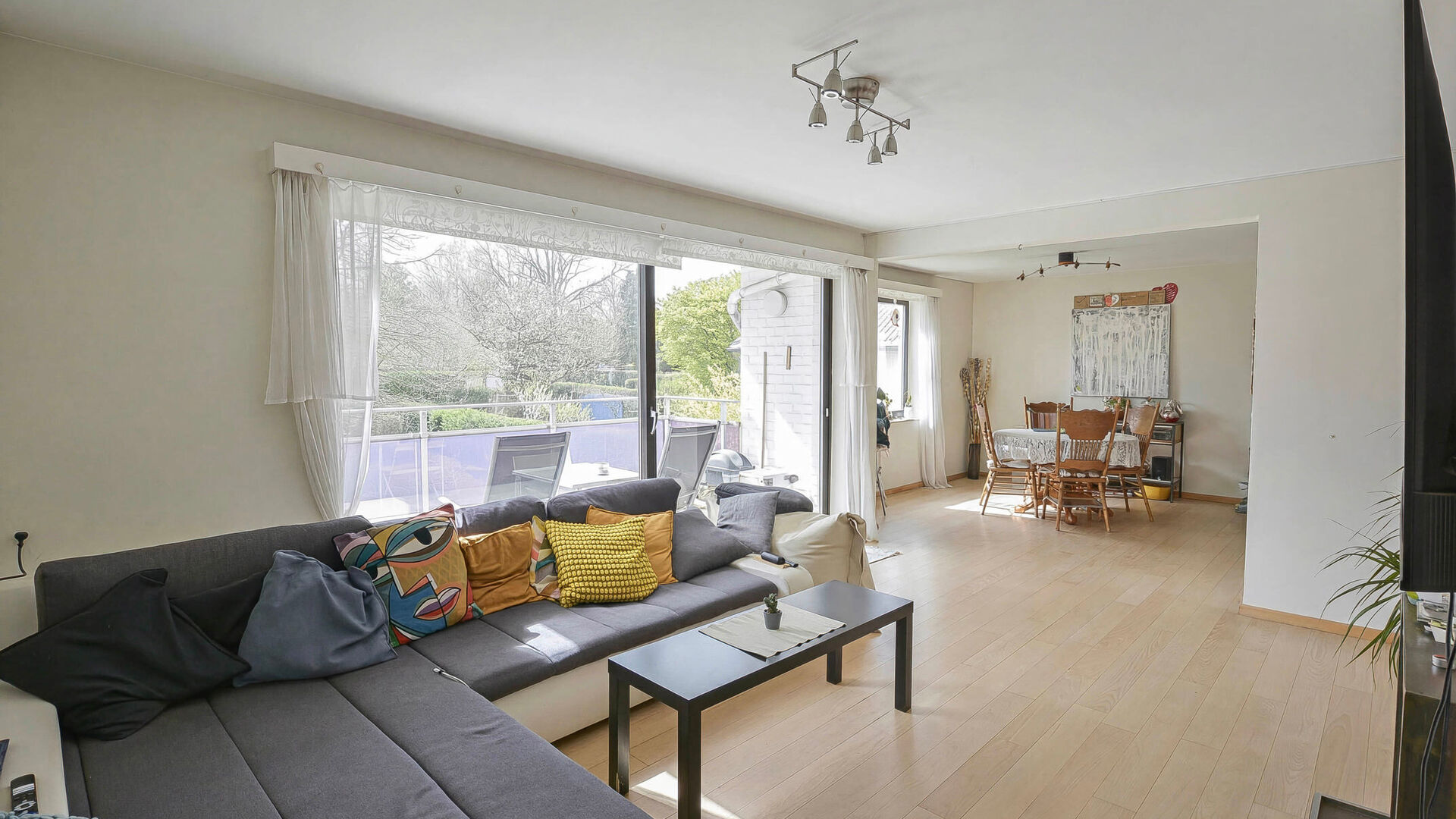 Inkomhal met vestiairehoek en apart toilet, lichtrijke woon- en eetkamer van +/- 30 m² met toegang tot het zuidgericht terras met zicht op de tuinen, volledig uitgeruste open keuken met ontbijthoek/bar. Nachthal met berging en aansluiting voor wasmachine. 3 slaapkamers van +/- 16 - 10 - 8 m² en een badkamer met bad en dubbele wastafel.