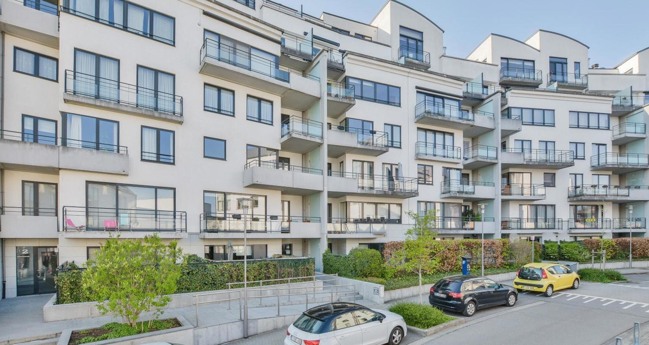 Inkomhal met vestiaire en apart toilet, een praktische berging/wasruimte, ruime en lichtrijke leefruimte van +/-32 m², volledig uitgeruste keuken toegang gevend tot een zuidgericht.. De nachthal geeft toegang tot een eerste badkamer (douche en wastafel), slaapkamer van +/-11m² en master bedroom van +/-15 m² met ensuite badkamer (bad, dubbele wastafel en toilet) en toegang tot een tweede terras. Een kelder en twee binnenstaanplaatsen + 51.000 € worden samen met het appartement verkocht.