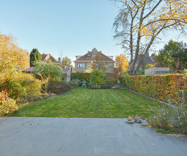 Eerste verdieping: overloop, volledig uitgeruste keuken met ontbijthoek, eetkamer en lichtrijke woonkamer die uitgeeft op een prachtige zuidgerichte tuin met tuinhuis.