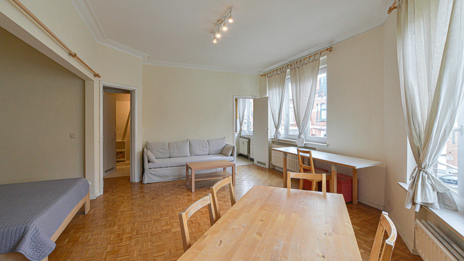 Deze mooie semi-gemeubileerde studio bevindt zich op de 1ste verdieping (zonder lift) en omvat: