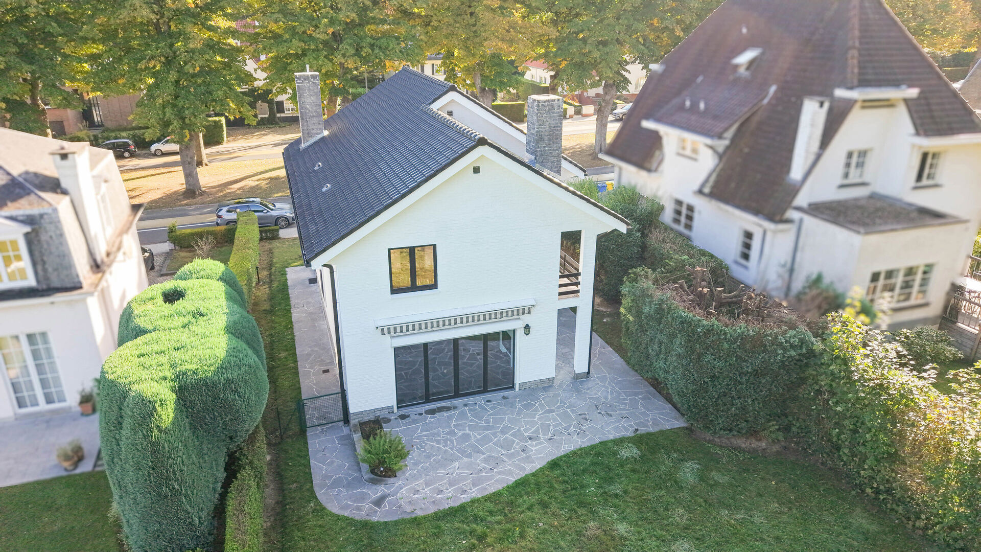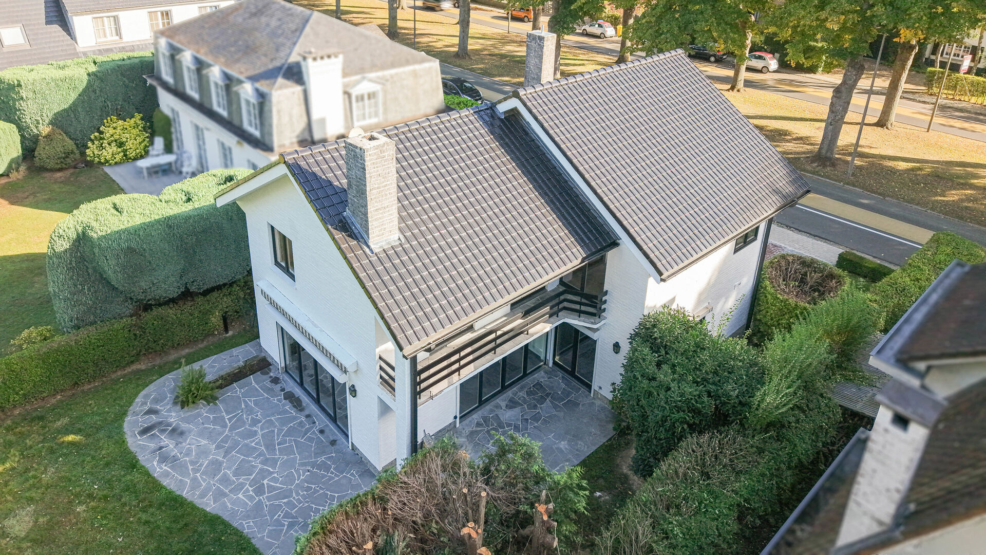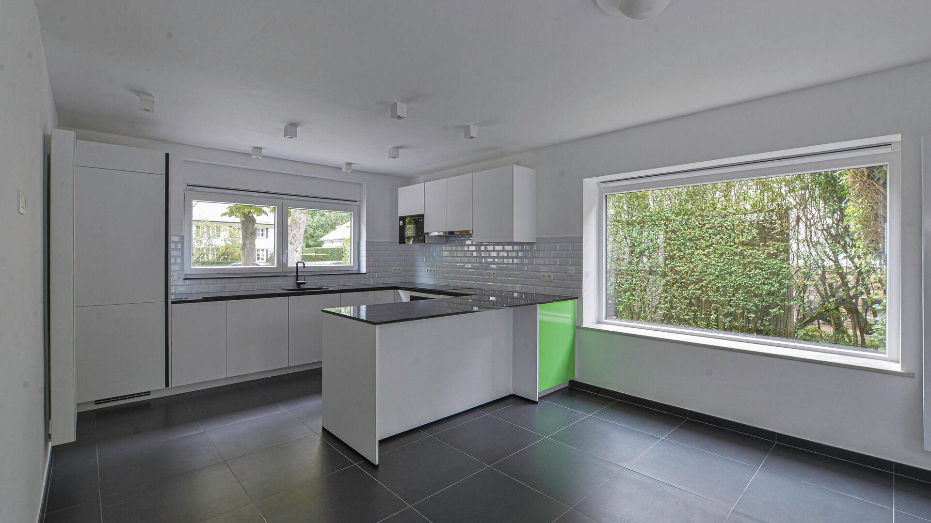Inkomhal met vestiaire en apart toilet // lichtrijke woonkamer van ca. 45 m² met open haard en toegang tot de zuidgerichte tuin // gloednieuwe volledig ingerichte keuken met ontbijthoek (koelkast/diepvries, oven, microgolf, vaatwasser, inductiekookplaat, dampkap, …). Verdieping: