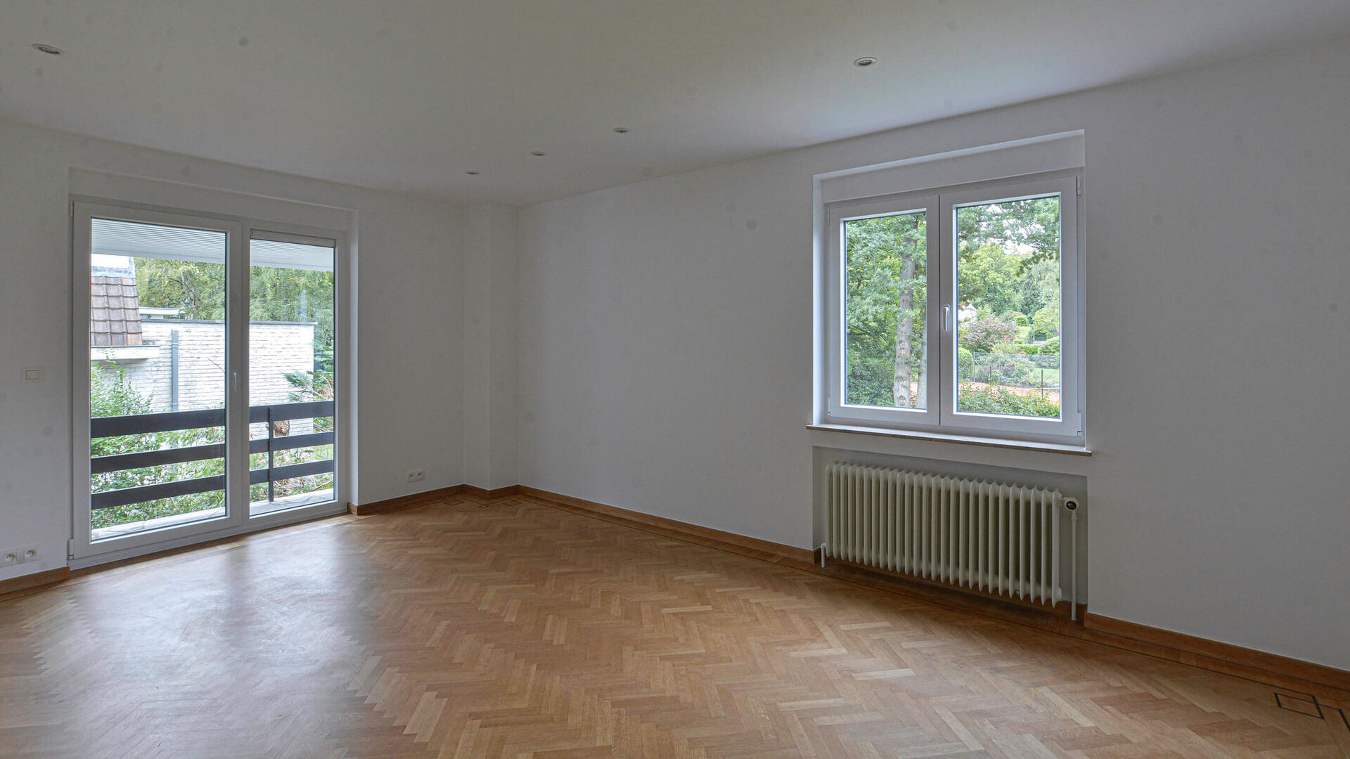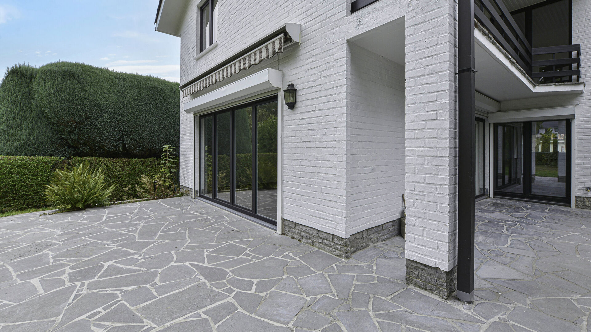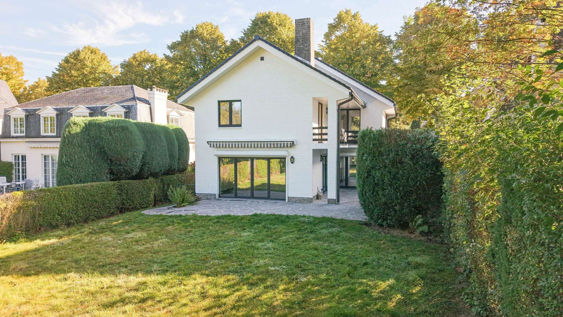 Inkomhal met vestiaire en apart toilet // lichtrijke woonkamer van ca. 45 m² met open haard en toegang tot de zuidgerichte tuin // gloednieuwe volledig ingerichte keuken met ontbijthoek (koelkast/diepvries, oven, microgolf, vaatwasser, inductiekookplaat, dampkap, …). Verdieping: