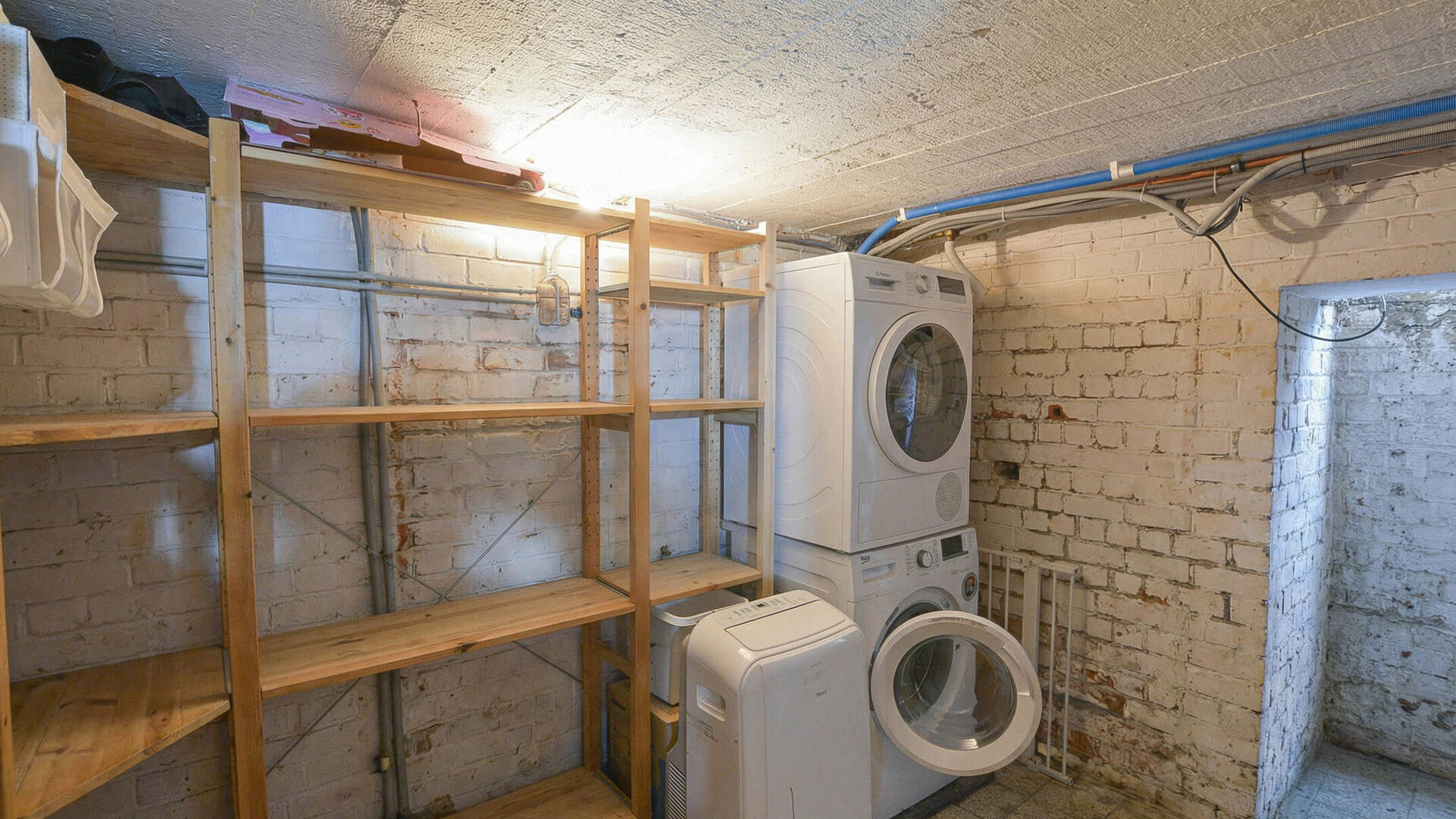 Onderverdiep: Technische ruimte, tellers, opbergplaats en aansluiting wasmachine.