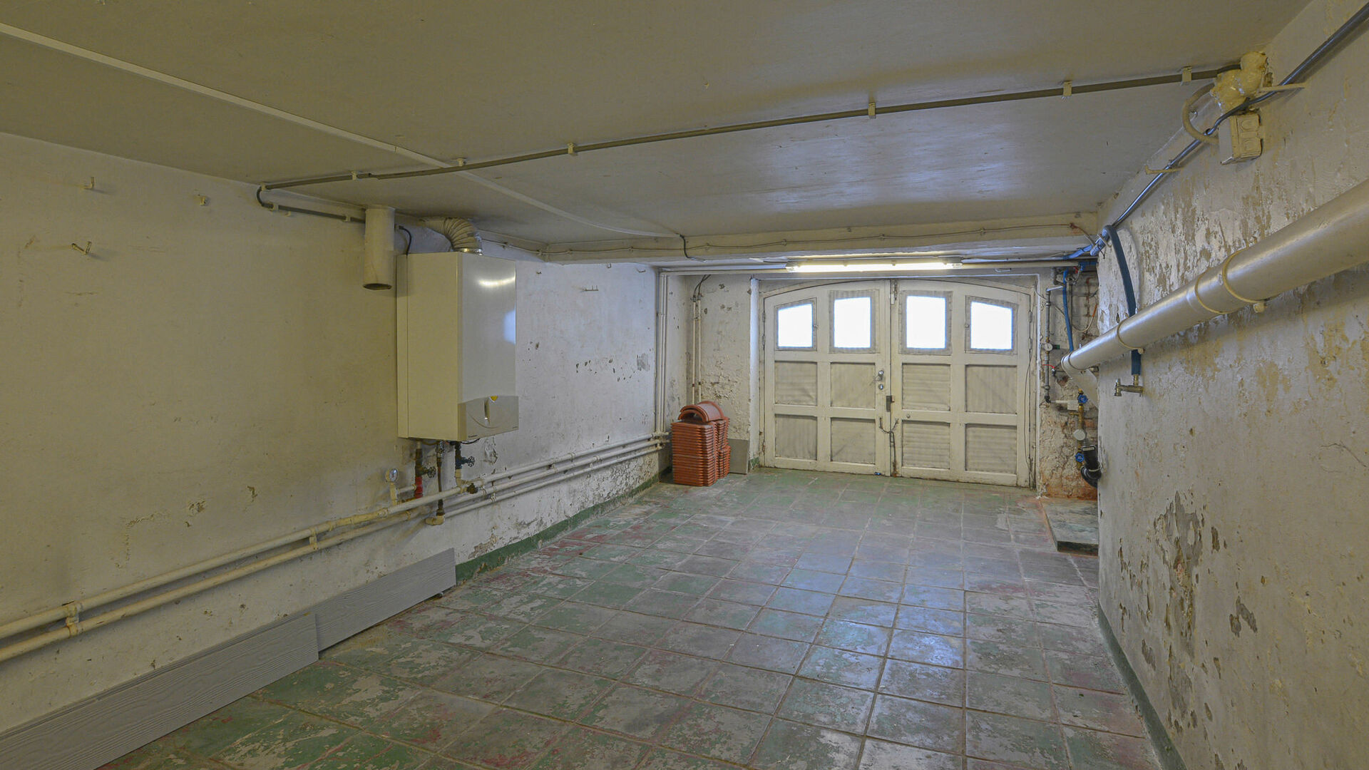 Onderverdiep: Garage voor 1 wagen + parkeerplaats op oprit, tellers en opbergruimte.