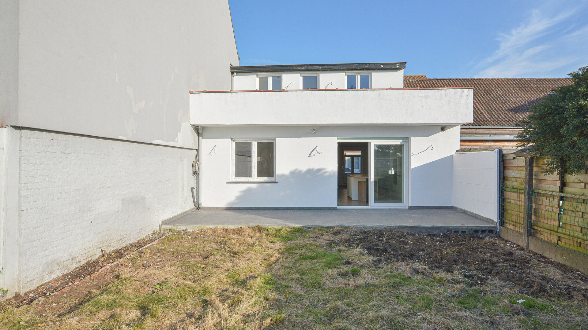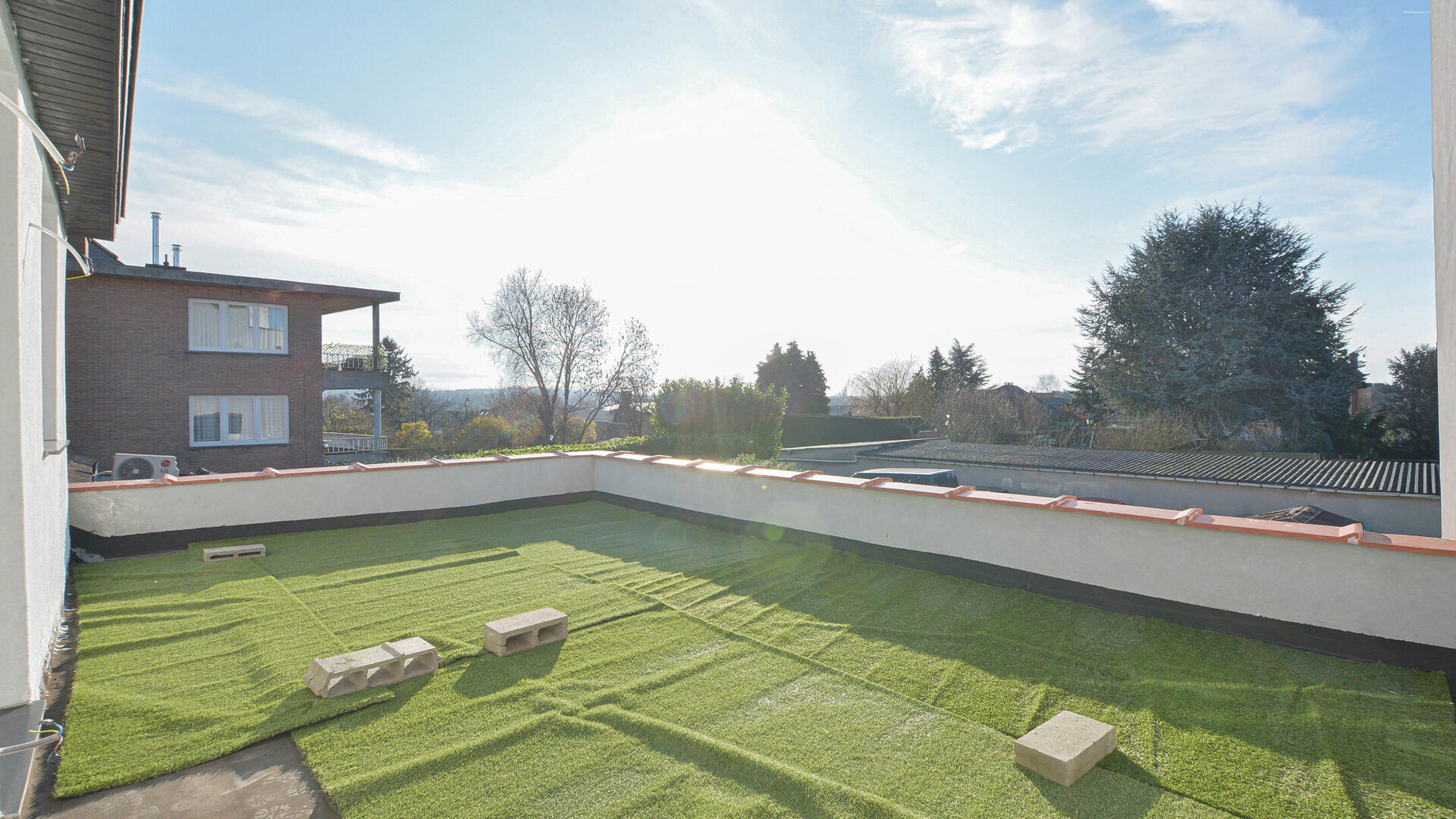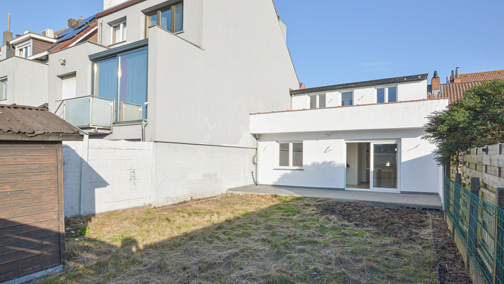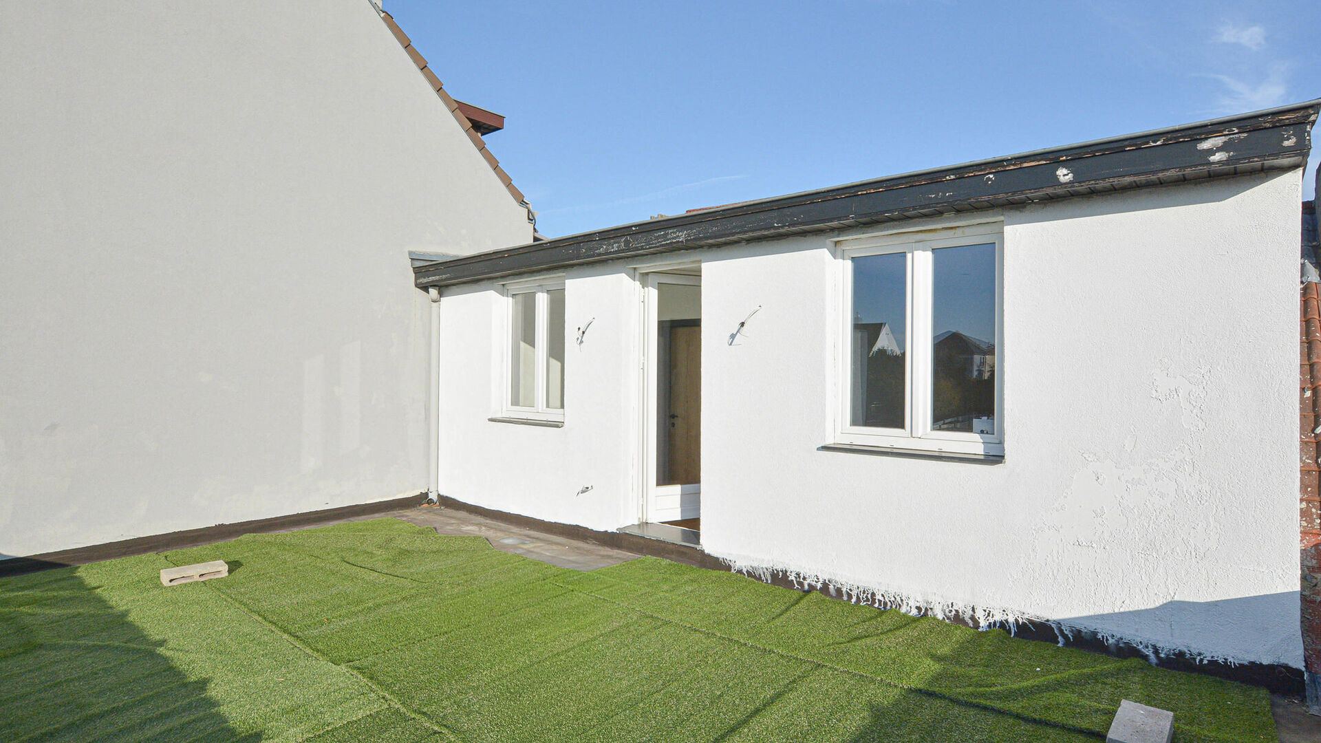 - 1e verdieping: nachthal met apart toilet, twee slaapkamers van +/-19 m² en +/-11 m². Tevens is er toegang tot een plat dak dat kan gebruikt worden als ruim dakterras.