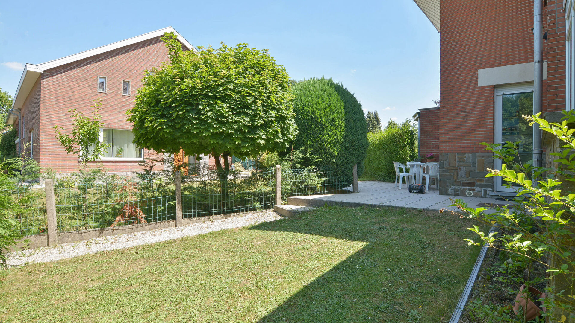 Het gelijkvloers omvat een inkomhal met gastentoilet en vestiaire, een lichtrijke leef- en eetruimte van +/-35 m² met toegang tot een aangenaam terras en een privé-tuin, evenals een ruime volledig ingerichte open keuken met ontbijthoek.