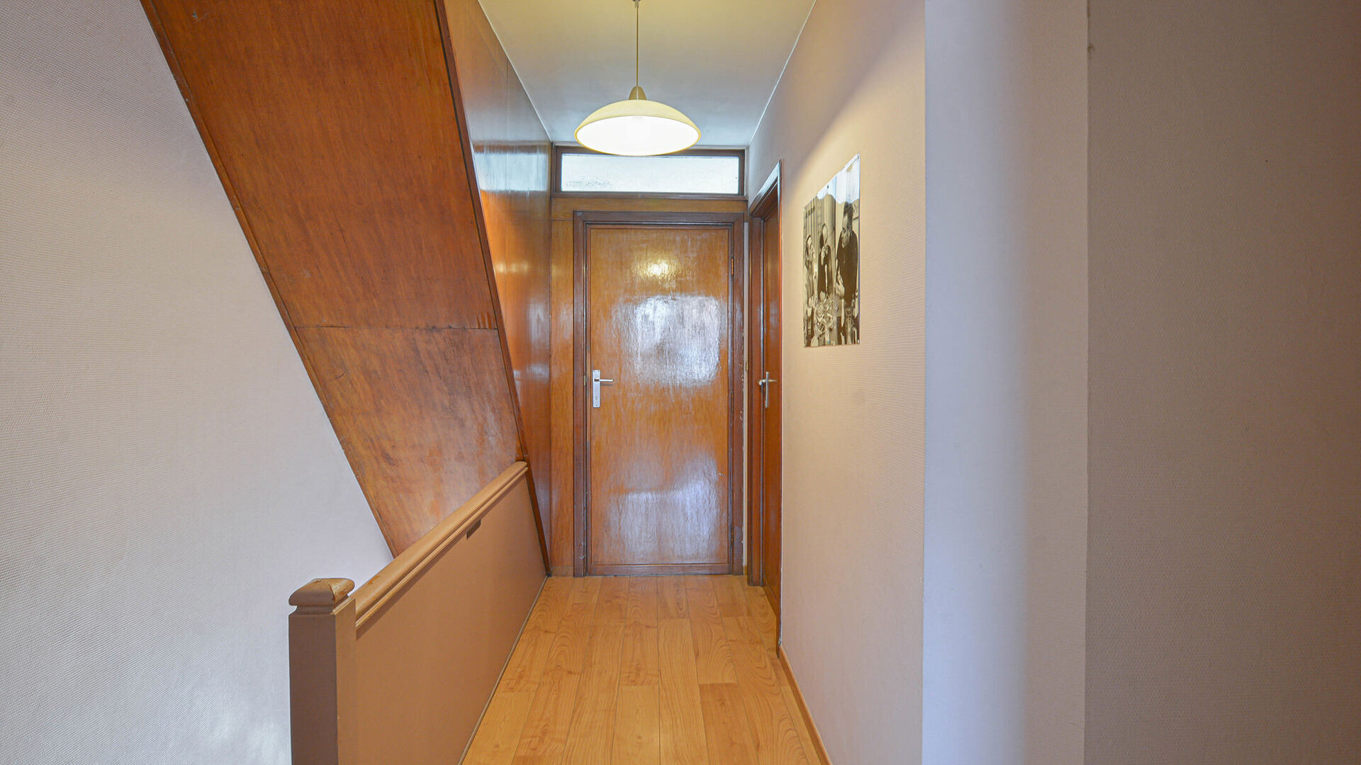 Op de eerste verdieping bevindt zich een nachthal die toegang biedt tot drie mooie slaapkamers +/- 14, 11 en 8 m² en een badkamer met kleine bad/douche, wastafel en toilet.