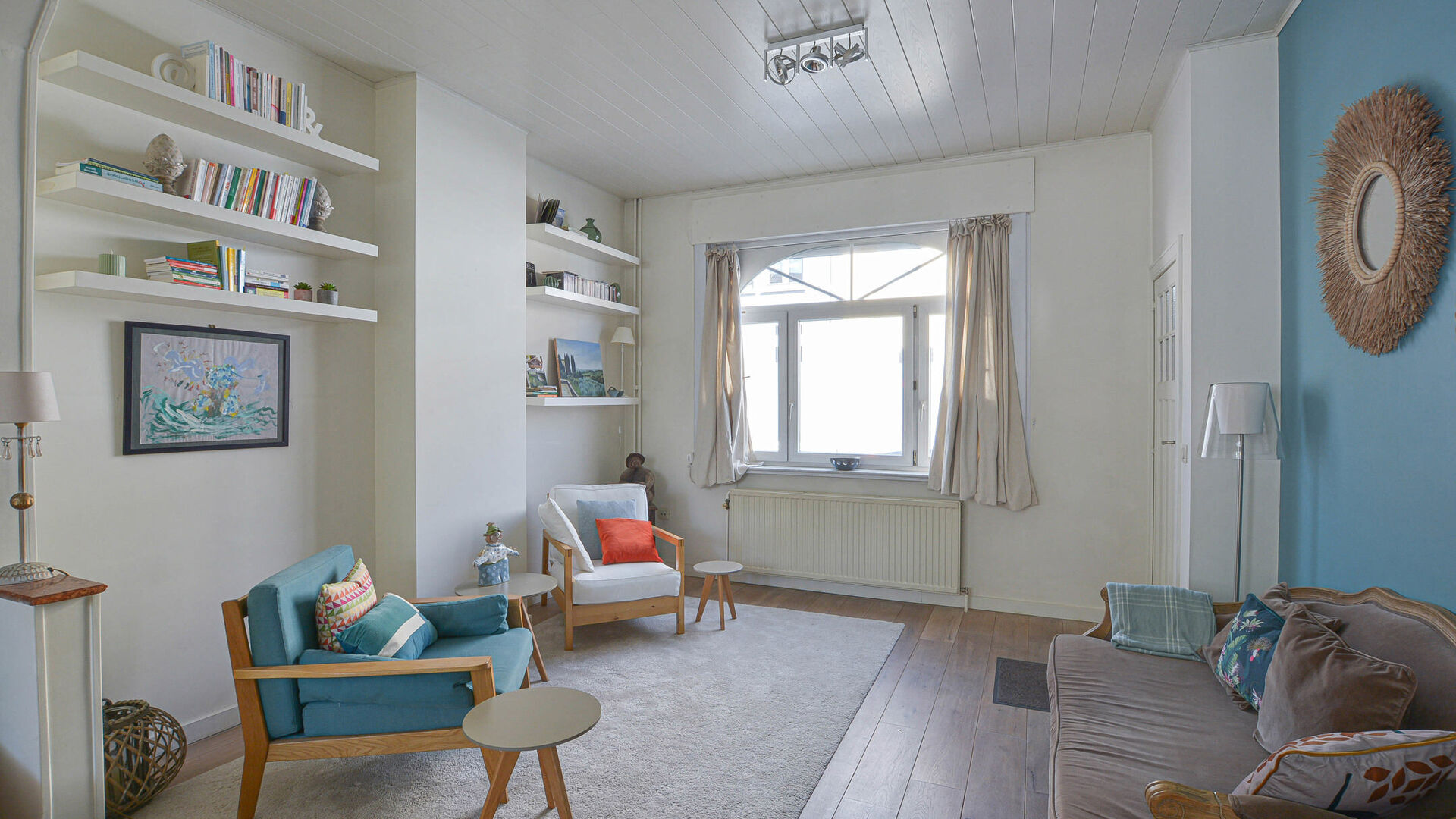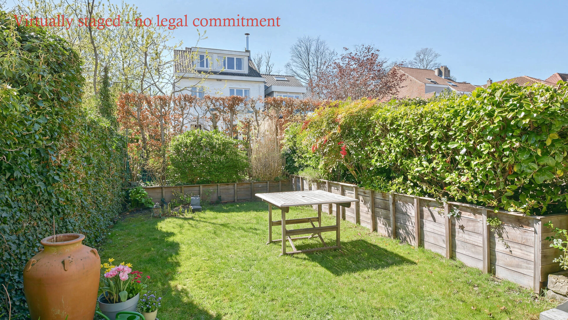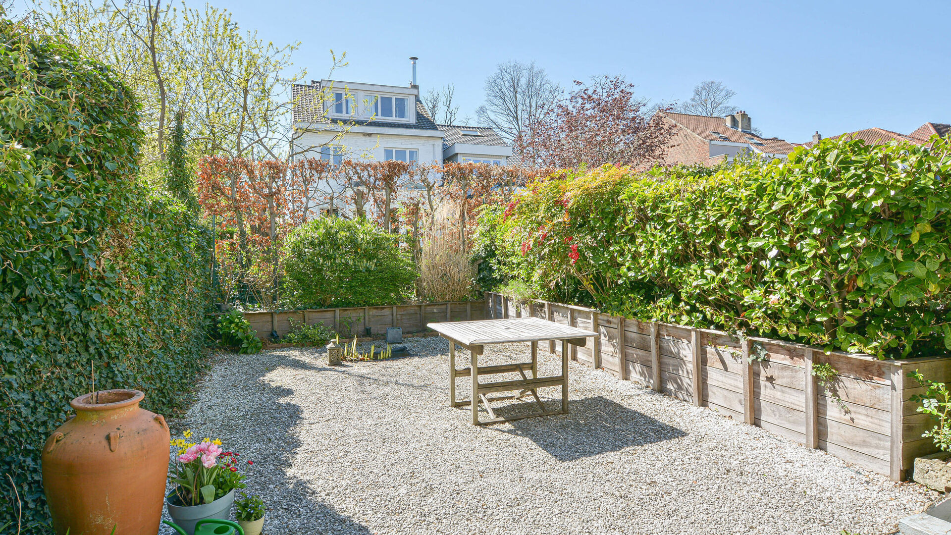 Gelijkvloers: inkomhal, lichtrijke woon- en eetkamer van ±27 m², apart toilet, volledig ingerichte keuken met ontbijthoek en toegang tot het terras en een onderhoudsvriendelijke tuin waarin opnieuw een grasveld kan worden aangelegd.