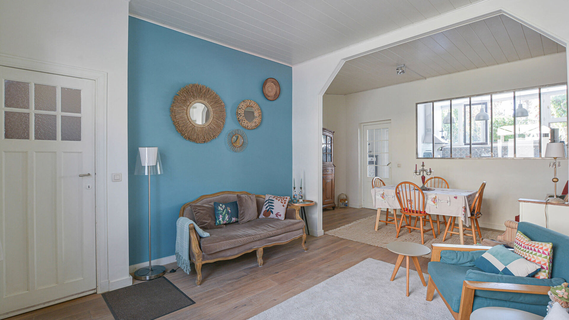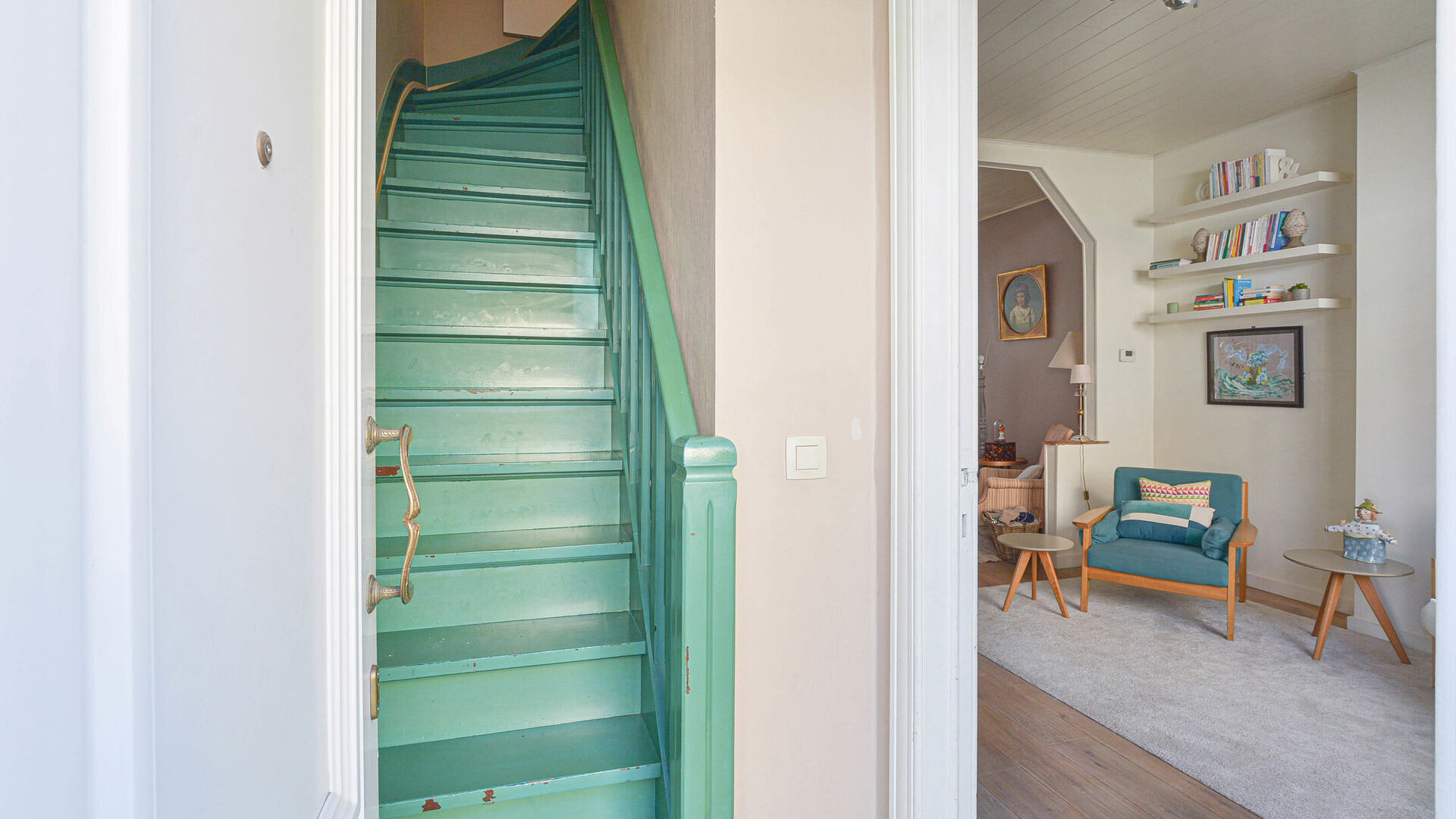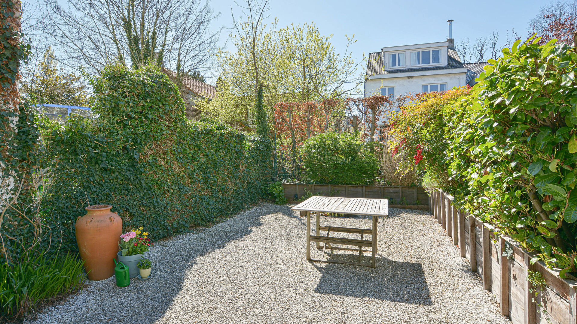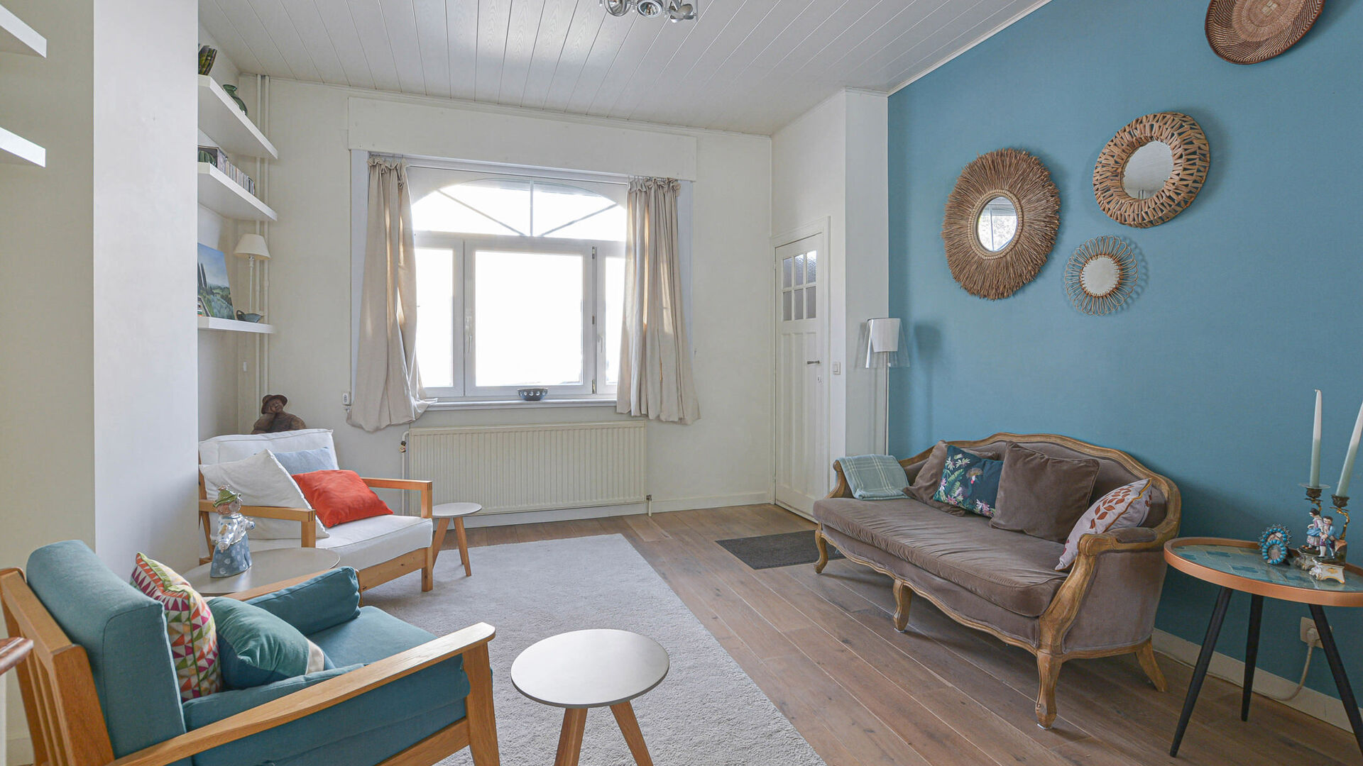 Gelijkvloers: inkomhal, lichtrijke woon- en eetkamer van ±27 m², apart toilet, volledig ingerichte keuken met ontbijthoek en toegang tot het terras en een onderhoudsvriendelijke tuin waarin opnieuw een grasveld kan worden aangelegd.