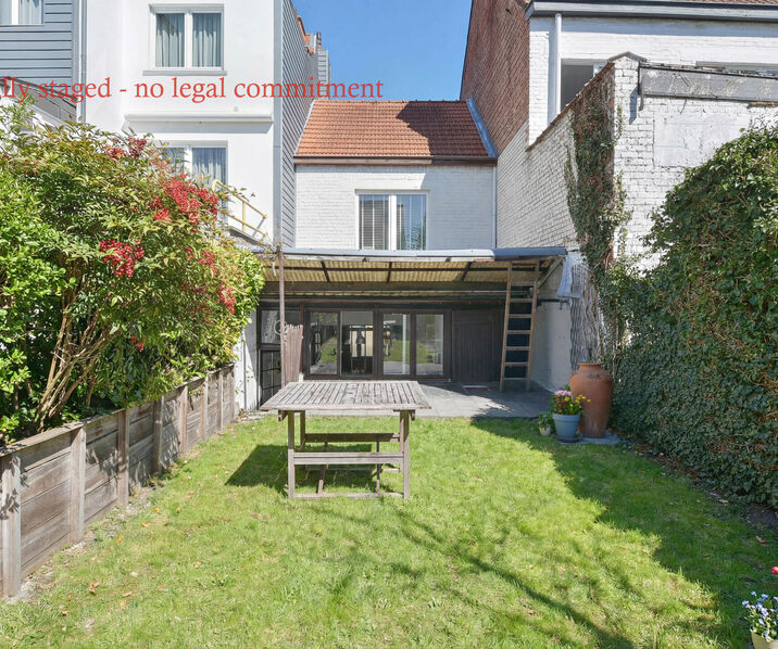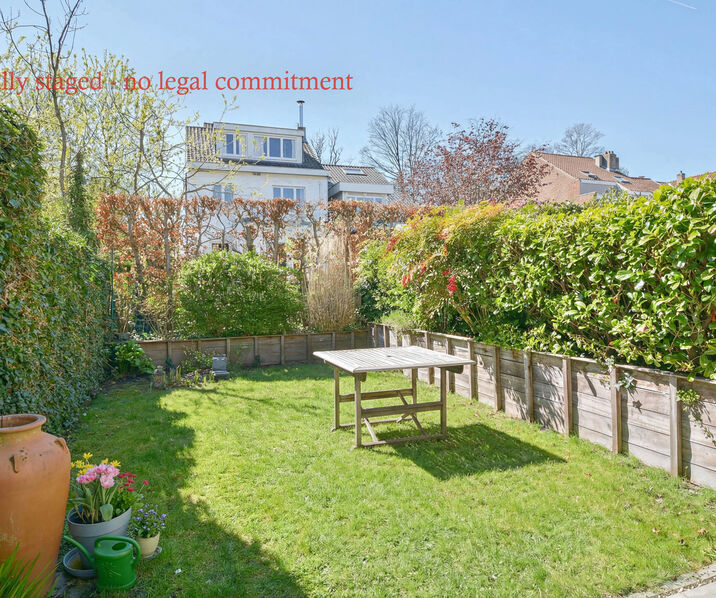 Gelijkvloers: inkomhal, lichtrijke woon- en eetkamer van ±27 m², apart toilet, volledig ingerichte keuken met ontbijthoek en toegang tot het terras en een onderhoudsvriendelijke tuin waarin opnieuw een grasveld kan worden aangelegd.