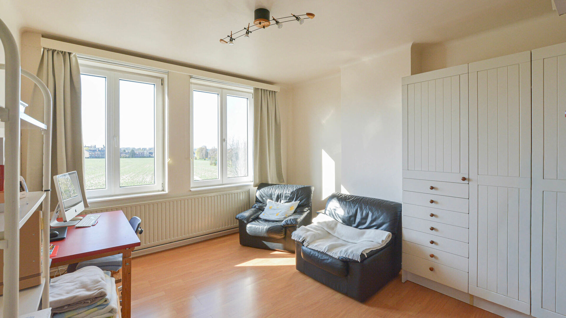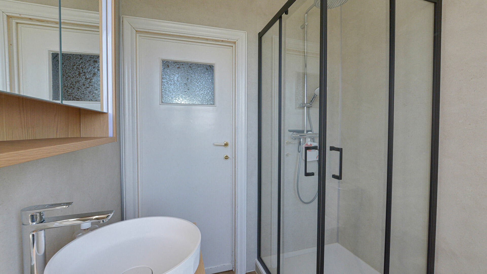 - 1e verdieping: Twee ruime slaapkamers van +/-15 m² en 14 m², een derde kamer +/-6m² (ideaal als bureau of kinderkamer) en een gerenoveerde badkamer uitgerust met douche, toilet en wastafel.