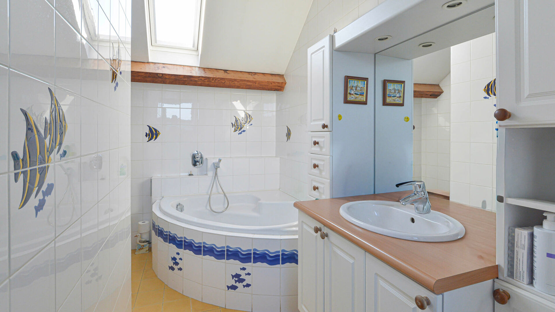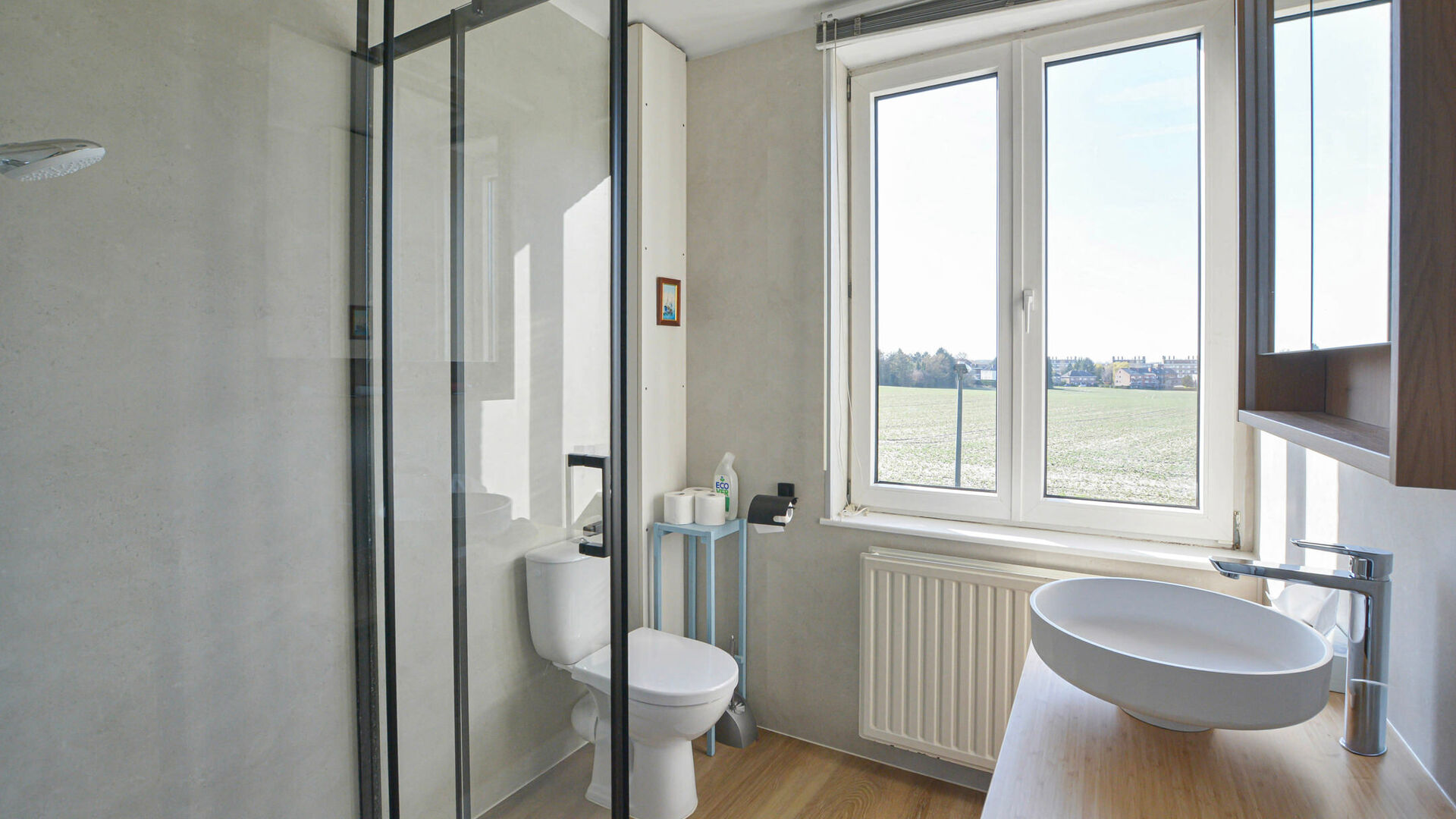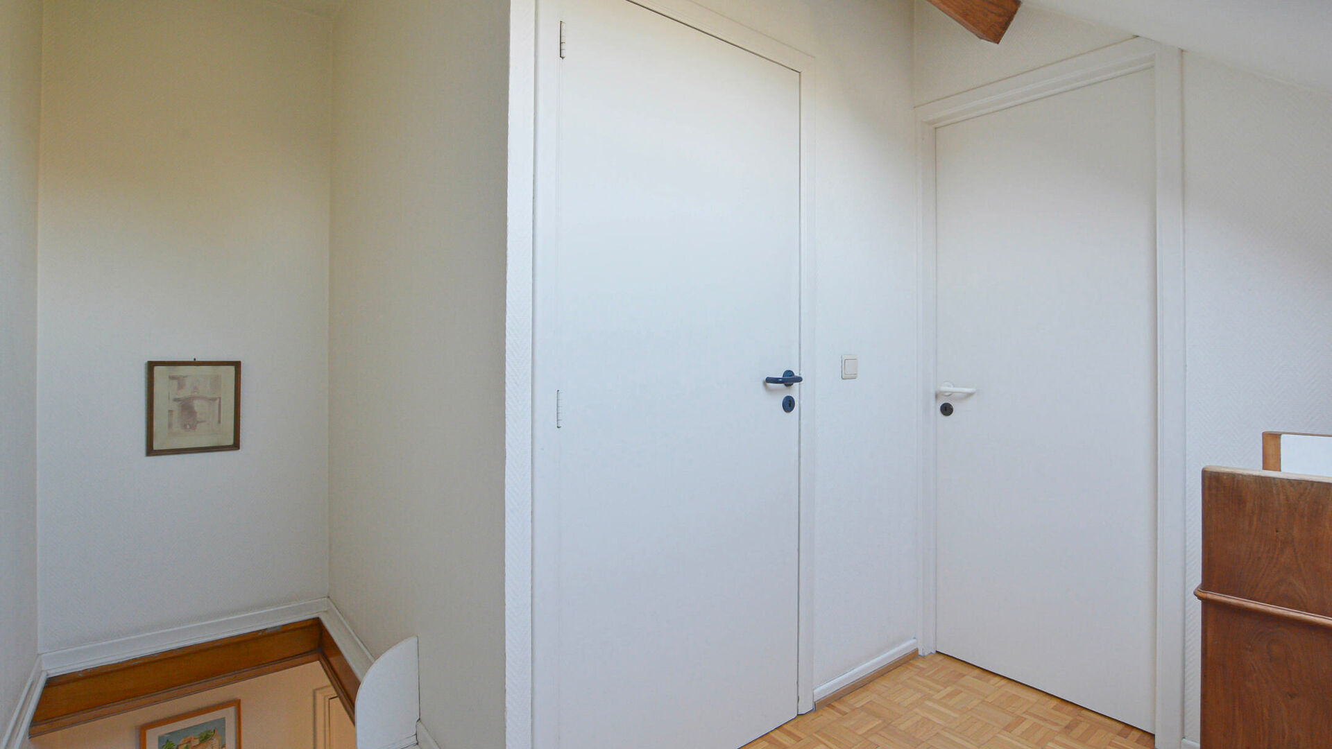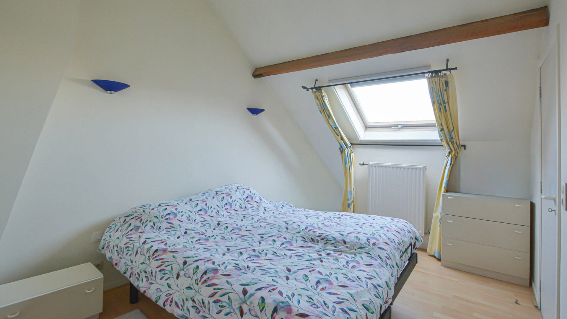 - 2e verdieping: Slaapkamer van +/- 15m² met ingebouwde kast, tweede badkamer (ligbad, toilet en wastafel) en praktische opbergzolder onder het dak.