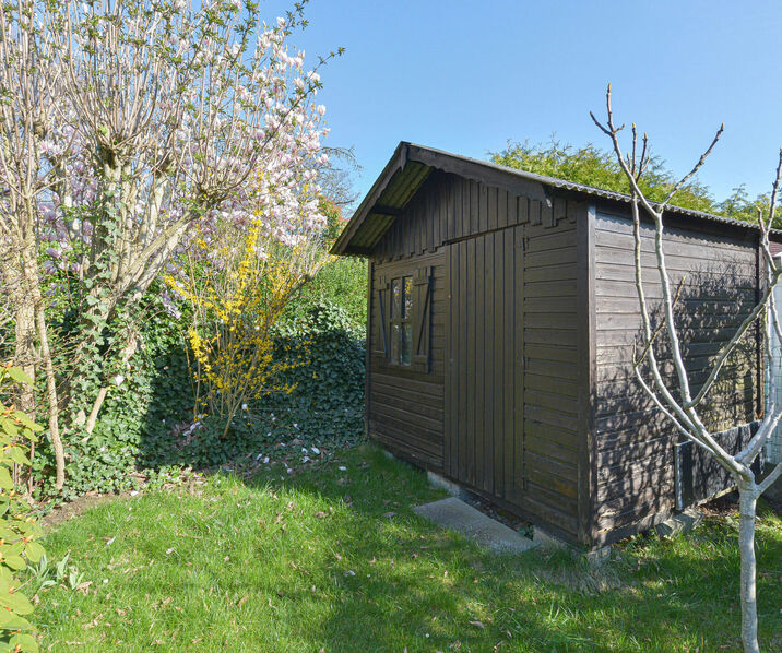 - Gelijkvloers: Inkomhal met apart toilet, lichtrijke woon- en eetkamer van +/-30 m², uitgeruste keuken met directe toegang tot een aangenaam privatief terras en een aansluitende tuin met tuinhuis.