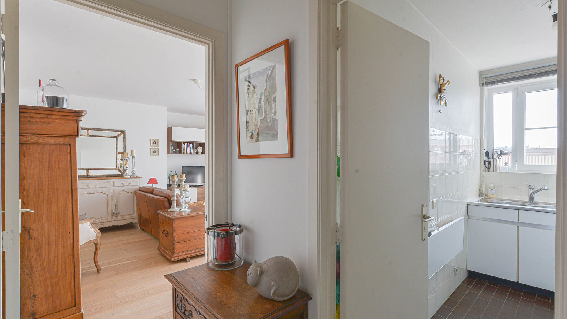 Inkomhal met vestiairehoek en apart toilet, een ingerichte keuken (oven, kookplaat) en een lichtrijke leef- en eetruimte van ± 18m² toegang gevend tot een aangenaam west georiënteerd terras, ideaal om van de avondzon te genieten. Het slaapgedeelte omvat een slaapkamer van ± 11 m² met aangrenzende badkamer, uitgerust met bad/douchecombinatie, wastafel en aansluiting voor een wasmachine.