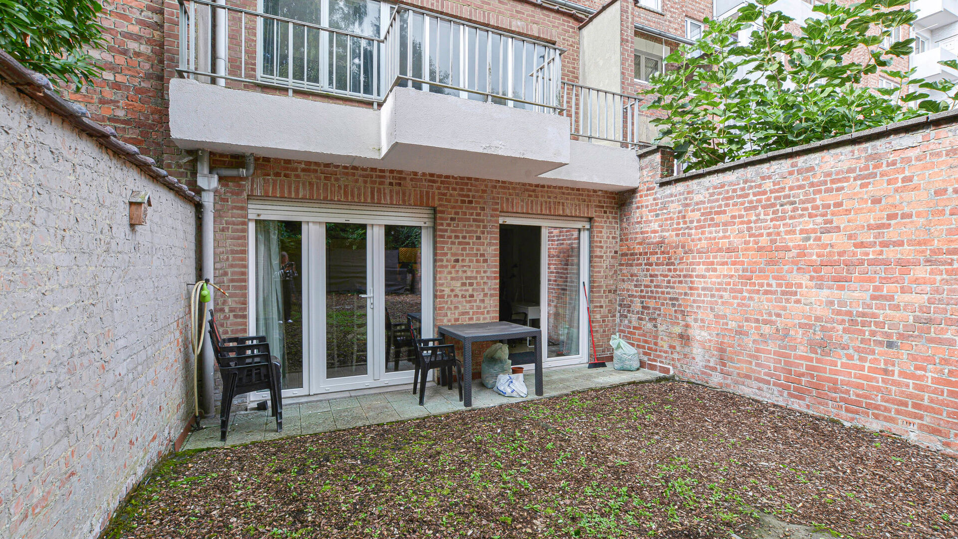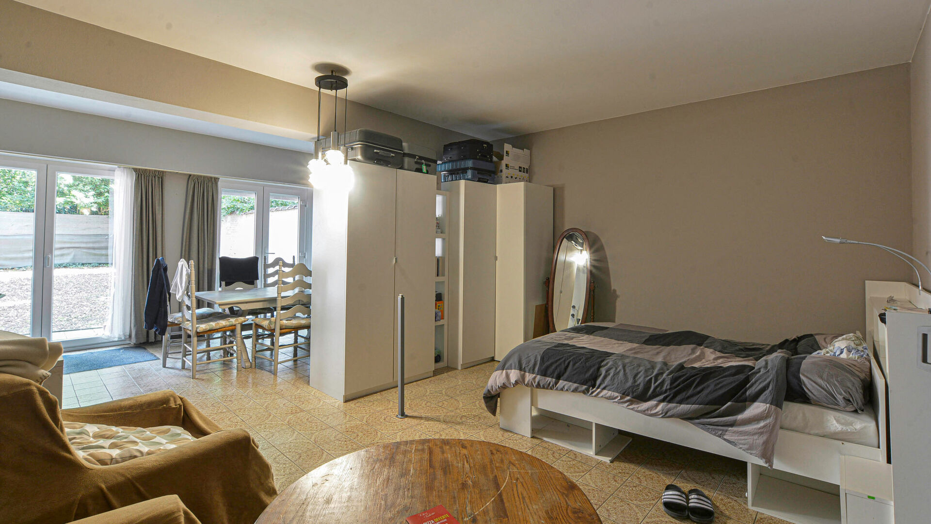 Ruime woonkamer met toegang tot de tuin, inclusief slaaphoek en eetruimte (+/- 39m²) // privé-tuin // aparte WC // volledig ingerichte keuken (gaskookplaten, oven, microgolfoven, vaatwasser, droogkast, koelkast/diepvriezer) // douchekamer (douche, wastafel, wasmachine).