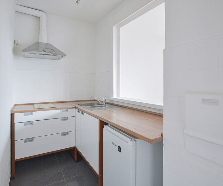 Inkomhal met ingebouwde vestiare kast, badkamer (douche, toilet en wastafel), keuken (kookplaat, koelkast, dampkap), lichtrijke leef/slaapgedeelte +/-16m².