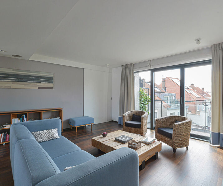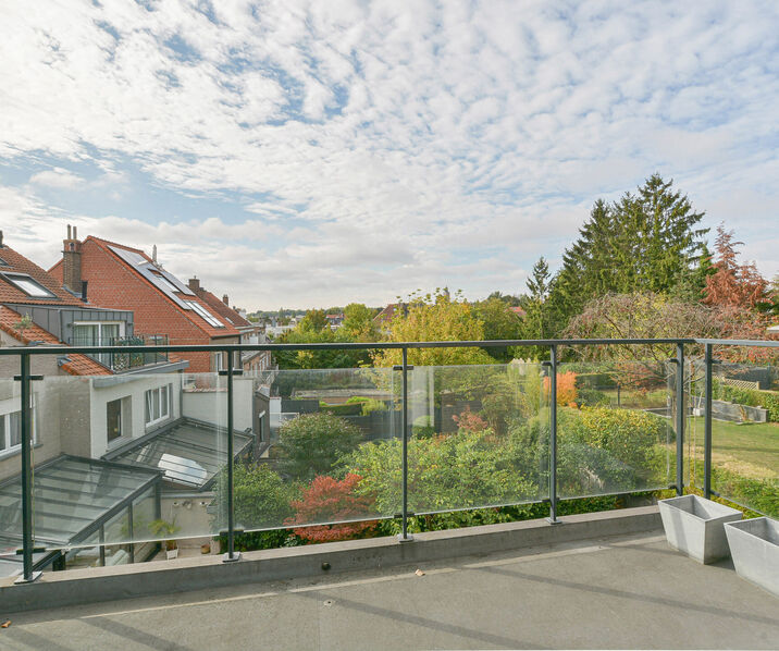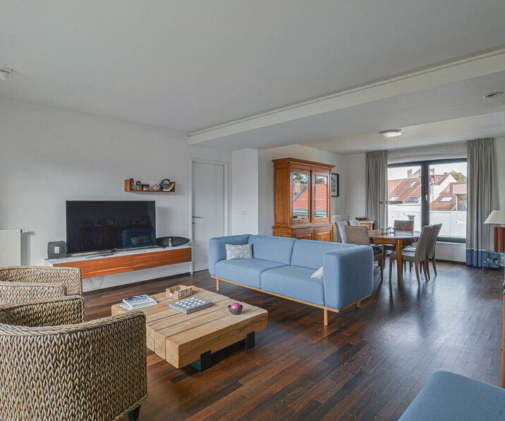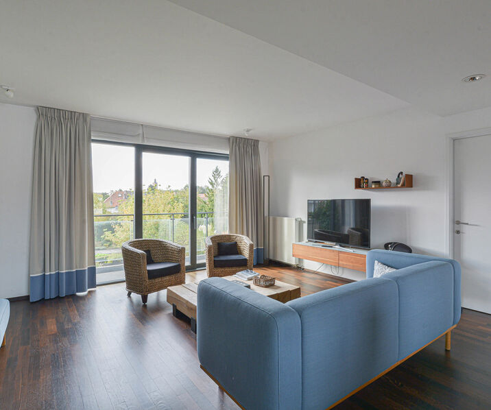 Dit appartement bevindt zich in een recente en standingvolle residentie. Met een bewoonbare oppervlakte van ongeveer 120 m² (2de verdieping op 3) bestaat het uit een inkomhal met apart toilet, een ruime en lichtrijke woon- en eetkamer die uitgeeft op een prachtig zuidgericht terras, ideaal om buiten te eten of te ontspannen.